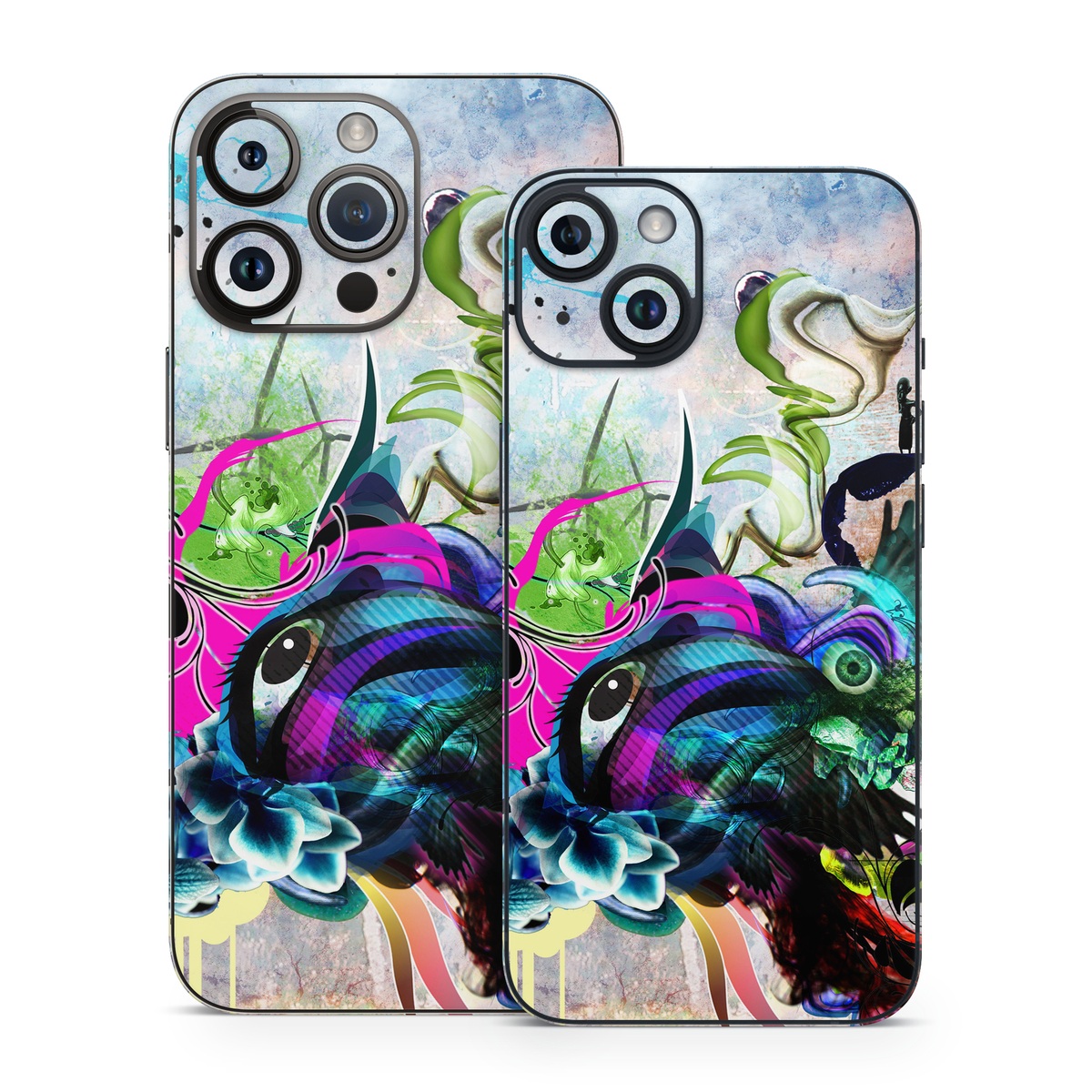 iStyles iPhone 14 Series Skin design of Graphic design, Psychedelic art, Art, Illustration, Purple, Visual arts, Graffiti, Street art, Design, Painting, with gray, black, blue, green, purple colors, and tagged with abstract, animals, flowers.