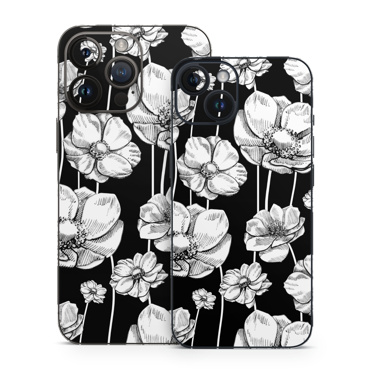 iStyles iPhone 14 Series Skin design of Flower, Black-and-white, Plant, Botany, Petal, Design, Wildflower, Monochrome photography, Pattern, Monochrome, with black, gray, white colors, and tagged with patterns, flowers.