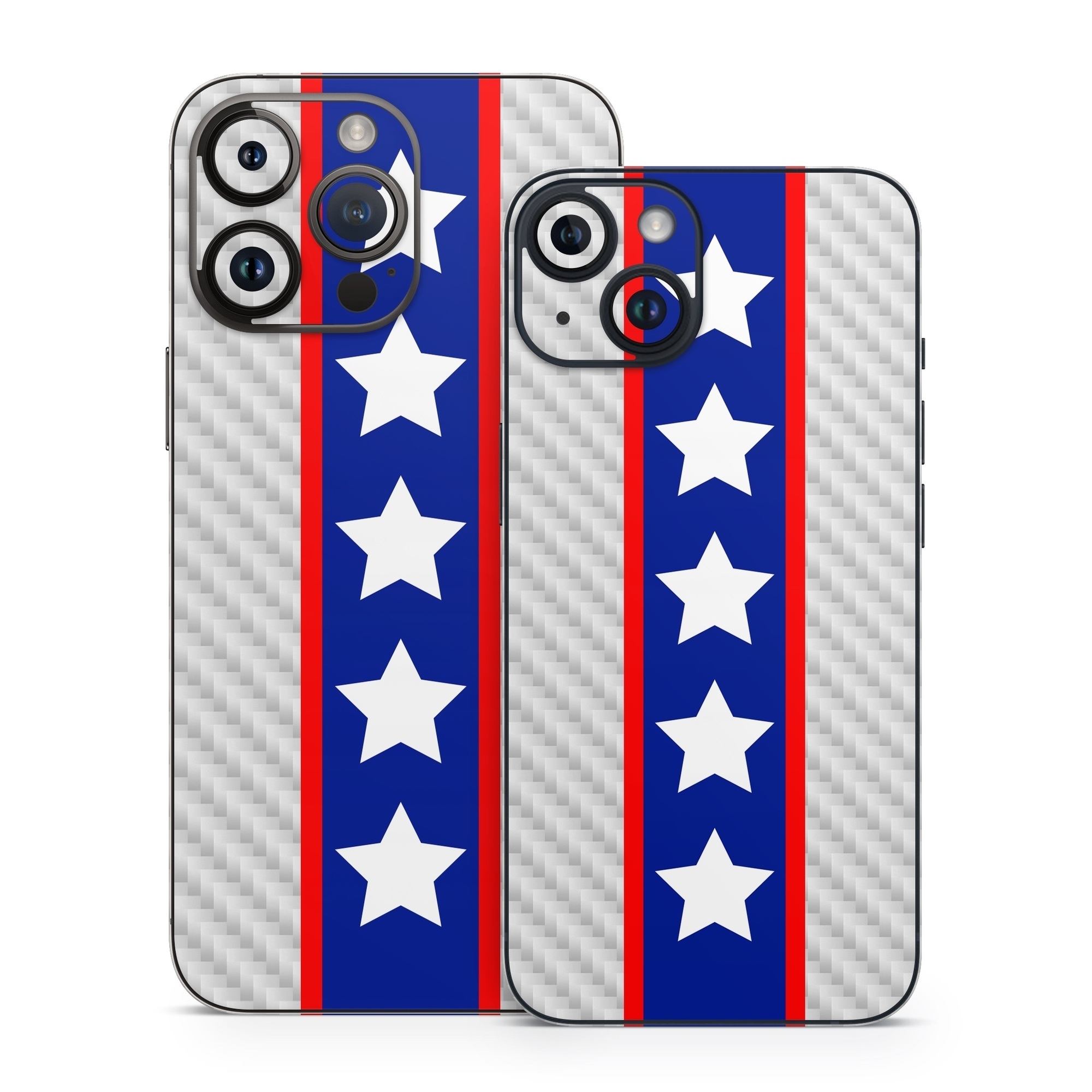 iStyles iPhone 14 Series Skin design of Flag of the united states, Flag, Font, Parallel, Electric blue, Rectangle, Pattern, Flag Day (USA), Symbol, Carmine, with gray, white, blue, red colors, and tagged with patterns, lookslike, stars, stripes, car.