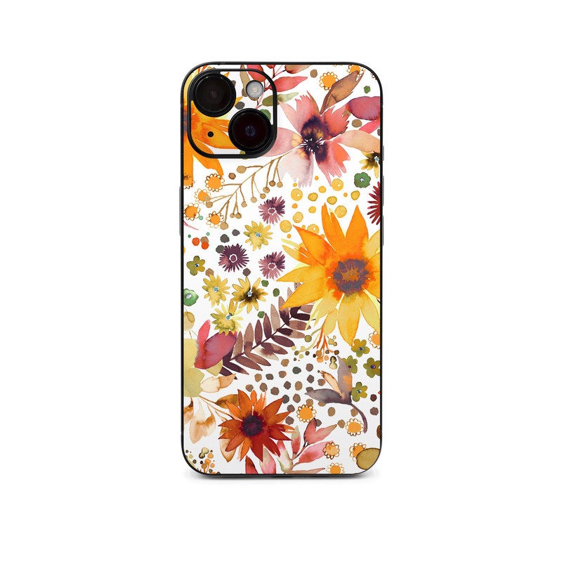 iStyles iPhone 14 Series Skin design of Flower, Plant, Petal, Botany, Textile, Orange, Line, Groundcover, Creative arts, Flowering plant, with white, yellow, pink, green, brown, orange colors, and tagged with animals, flowers, patterns, sunflowers, leaves, spring.