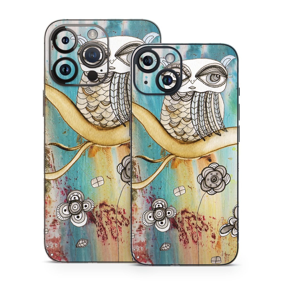 iStyles iPhone 14 Series Skin design of Owl, Pink, Illustration, Art, Visual arts, Watercolor paint, Organism, Modern art, Graphic design, Pattern, with gray, red, green, black, blue, purple colors, and tagged with patterns, animals, flowers.