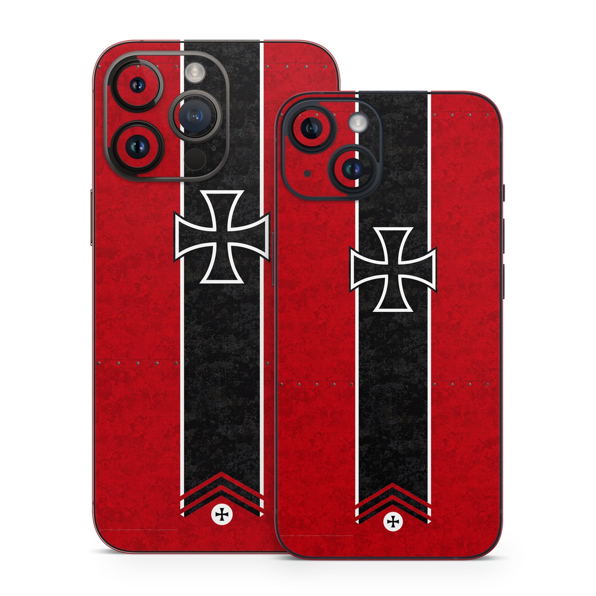 iStyles iPhone 14 Series Skin design of Bullet, Holes, War, Red, Text, Carmine, Colorfulness, Maroon, Symbol, Coquelicot, with red, black, white, gray colors, and tagged with lookslike, military, fantasy, cross, fighter, plane, red, redbaron.