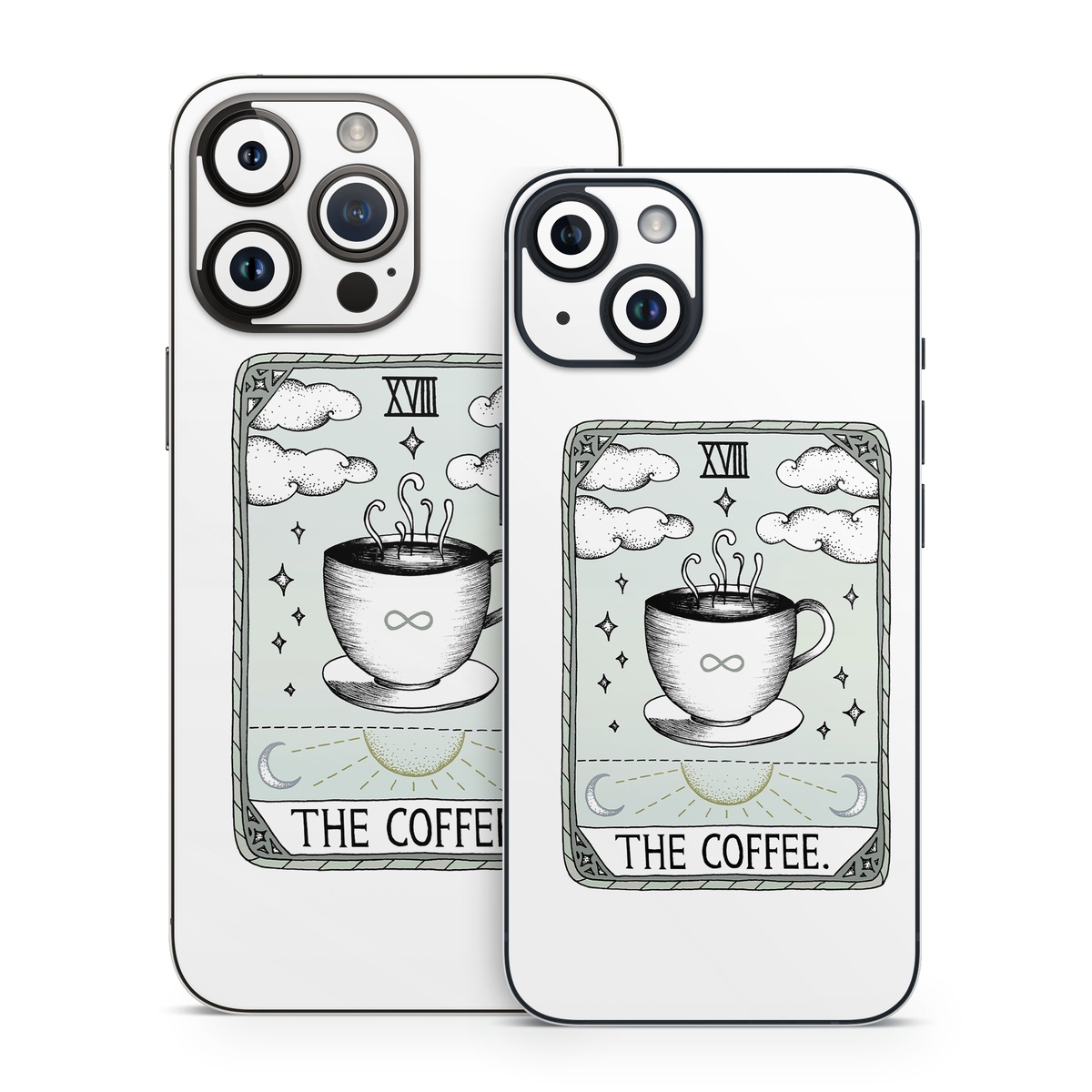 iStyles iPhone 14 Series Skin design of Cup, Cartoon, Drinkware, Coffee cup, Tableware, Teacup, Illustration, Drink, Line art, with white, black, green, gray, yellow colors, and tagged with objects, signs, space, coffee, handdrawn, pastel, sketch, tarot.