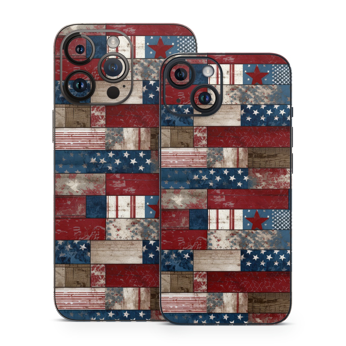 iStyles iPhone 14 Series Skin design of Photograph, White, Blue, Rectangle, Azure, Textile, Creative arts, Red, Line, Art, with red, blue, white, brown, gray, black colors, and tagged with flags, patterns, signs, united, states, flag, wooden, panels, mosaic, worn.