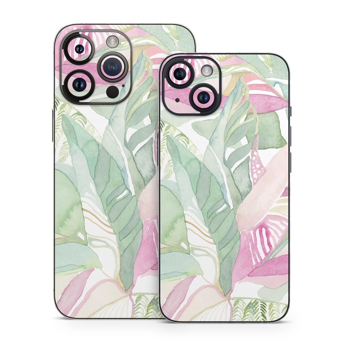 iStyles iPhone 14 Series Skin design of Pink, Leaf, Botany, Pattern, Plant, Flower, Illustration, with white, green, pink, orange colors, and tagged with patterns, abstract, nature, beach, palmleaves, palmtrees, spring, summer, tropical, tropics.