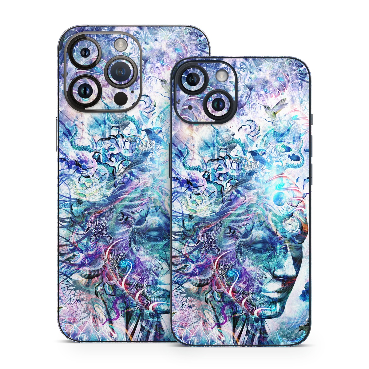 iStyles iPhone 14 Series Skin design of Psychedelic art, Water, Fractal art, Art, Pattern, Graphic design, Design, Illustration, Electric blue, Visual arts, with blue, purple, green, red, gray, white colors, and tagged with animals, nature, flowers.