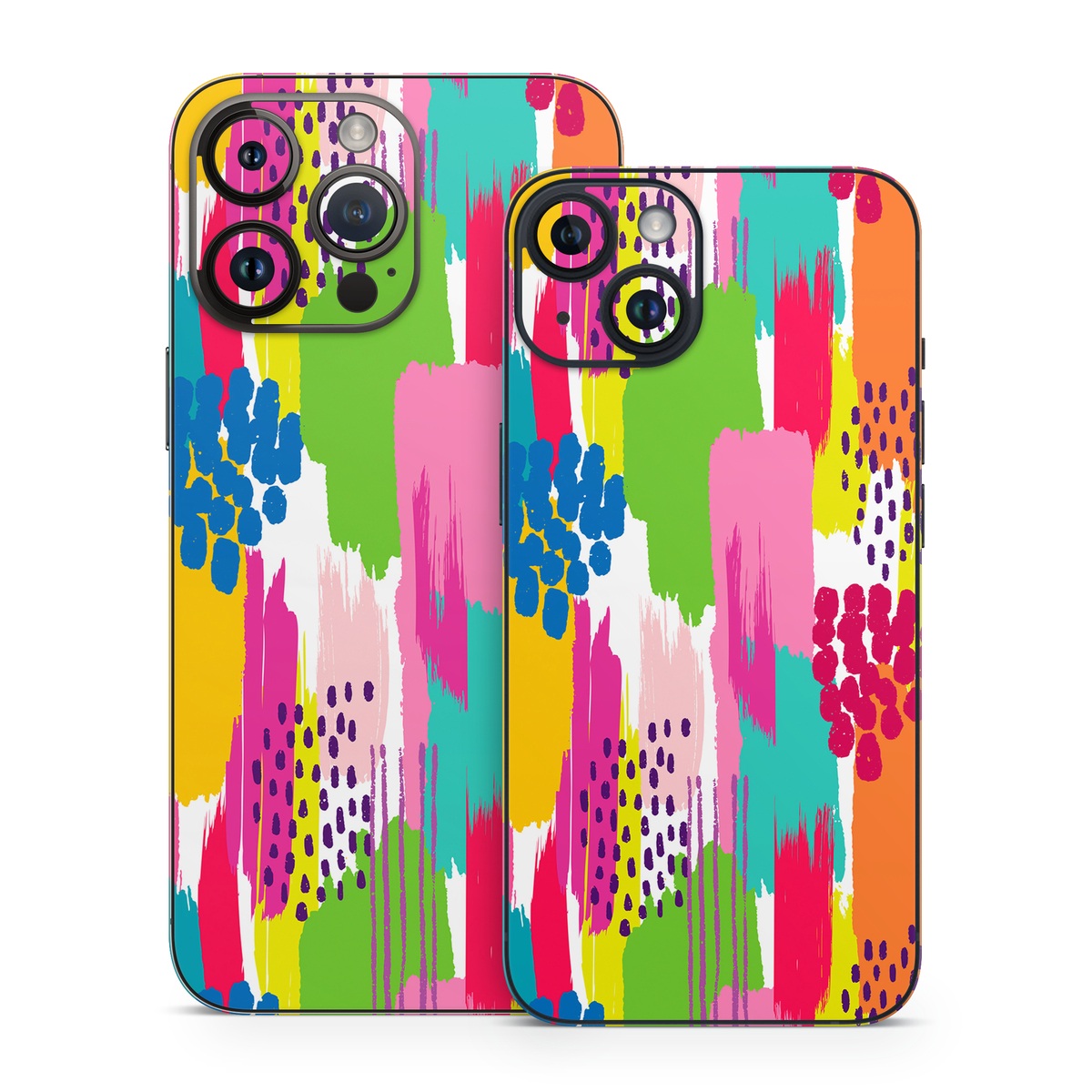 iStyles iPhone 14 Series Skin design of Colorfulness, Textile, Rectangle, Font, Line, Painting, Art, Magenta, Material property, Pattern, with white, pink, yellow, orange, blue, red colors, and tagged with patterns, abstract, brush, brushstrokes, dots, lines, paint, splatter.