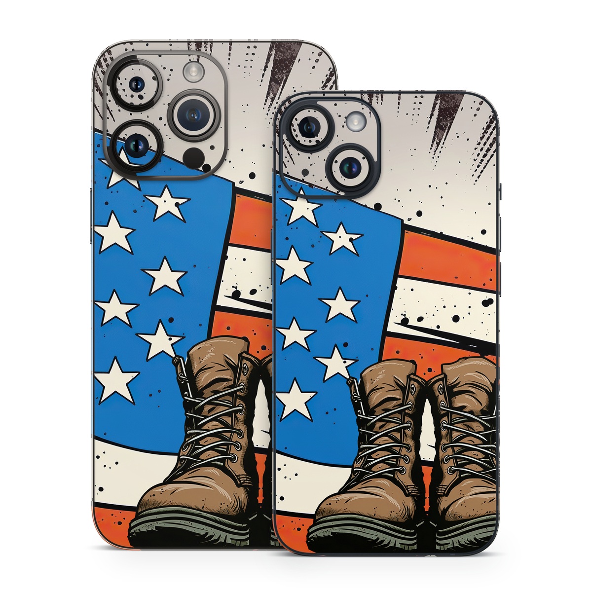 iStyles iPhone 14 Series Skin design of Footwear, Shoe, Walking shoe, Outdoor shoe, Line, Flag of the united states, Sneakers, Font, Art, Human leg, with red, blue, white, black, brown, gray colors, and tagged with flags, objects, signs, military, united, states, flag, military, boots, walking, training.