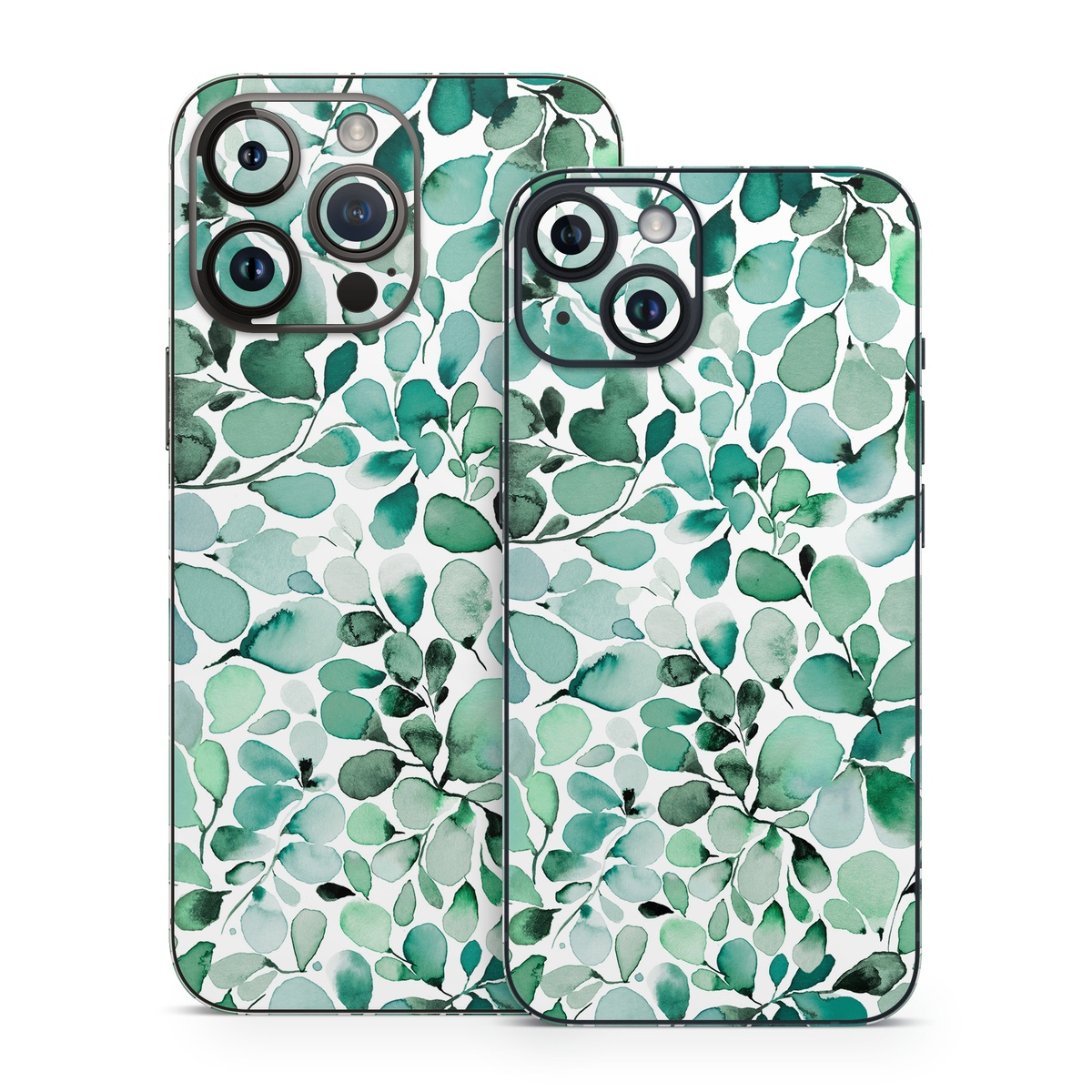 iStyles iPhone 14 Series Skin design of Azure, Line, Aqua, Pattern, Art, Symmetry, Electric blue, Circle, Creative arts, Terrestrial plant, with white, green, black colors, and tagged with patterns, nature, filigree, garden, green, leaves, nature, paint, painting, teal, turquoise, watercolor.