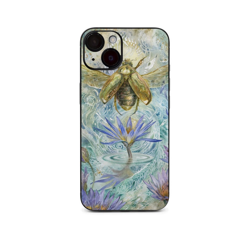 iStyles iPhone 14 Series Skin design of Painting, Fictional character, Art, Flower, Watercolor paint, Plant, Wildflower, Angel, Honeybee, Mythology, with blue, yellow, brown, purple, red, white colors, and tagged with animals, nature, flowers, bug, bugs, flowers, insects, water.