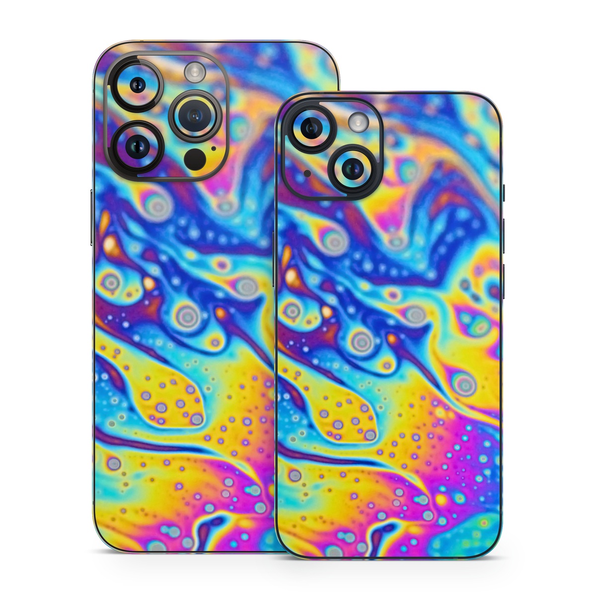 iStyles iPhone 14 Series Skin design of Psychedelic art, Blue, Pattern, Art, Visual arts, Water, Organism, Colorfulness, Design, Textile, with gray, blue, orange, purple, green colors, and tagged with patterns.