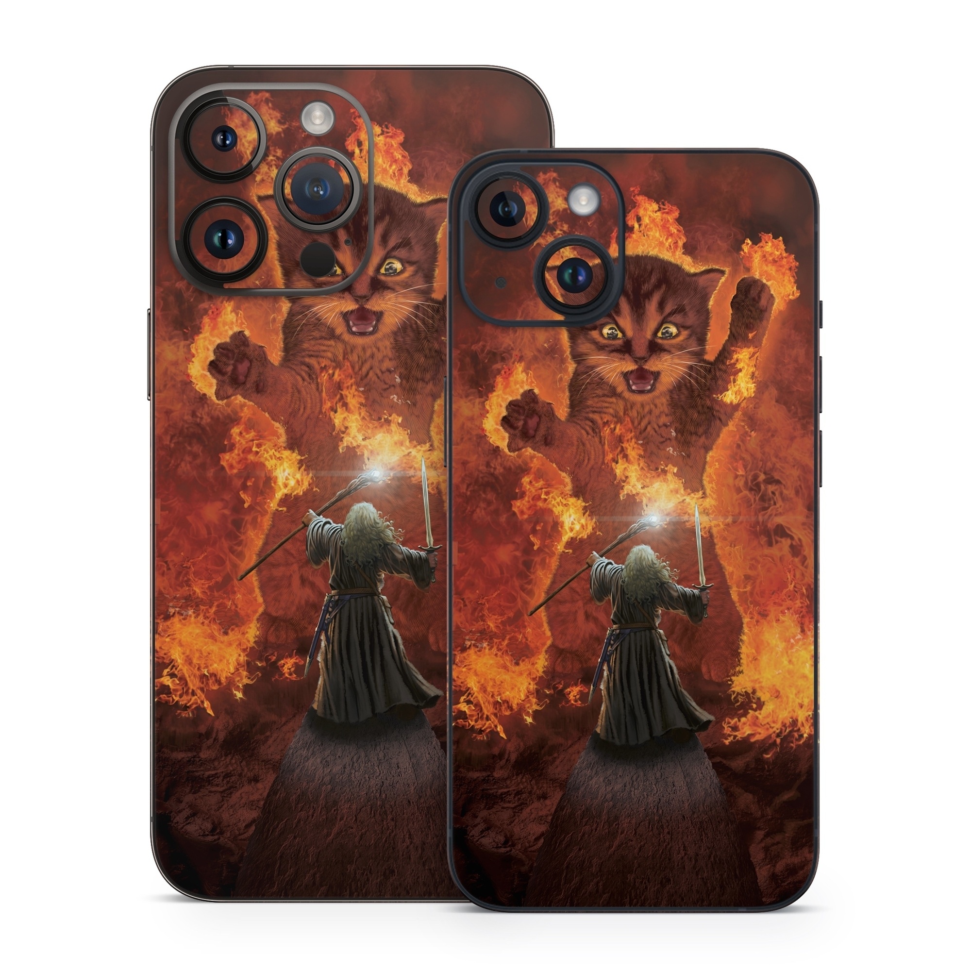 iStyles iPhone 14 Series Skin design of Cartoon, Art, Carnivore, Cg artwork, Felidae, Supernatural creature, Big cats, Heat, Fictional character, Darkness, with black, red, white, gray, yellow colors, and tagged with animals, fantasy, objects, people, flames, cat, wizard, fire, sword, magic, gatekeeper.