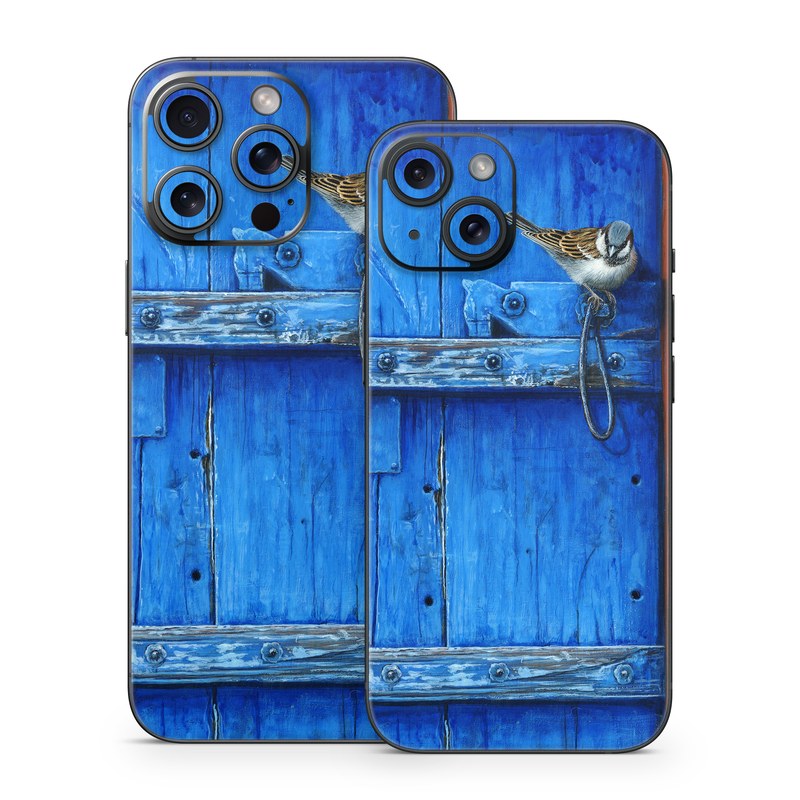 iStyles iPhone 15 Series Skin design of Blue, Wood, Door handle, Door, Wall, Door knocker, Electric blue, Still life photography, Window, Handle, with red, blue, brown colors, and tagged with animals, fineart, animal, bird, birds, fineart, outdoors.