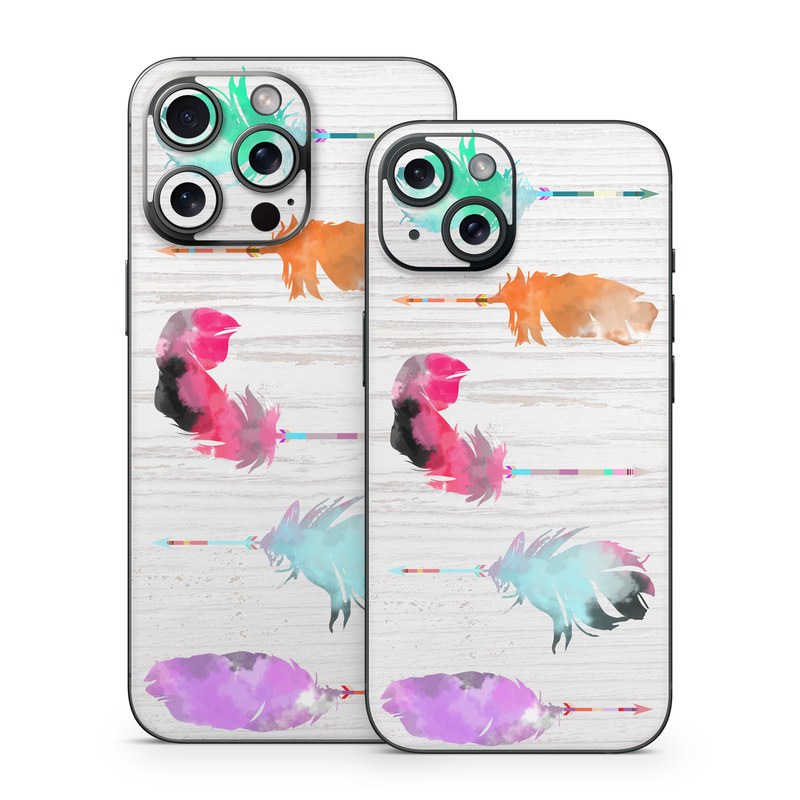 iStyles iPhone 15 Series Skin design of Pink, Watercolor paint, Illustration, Feather, Design, Art, Painting, Graphic design, Visual arts, Drawing, with white, orange, red, blue, pink, purple, green colors, and tagged with patterns, objects.