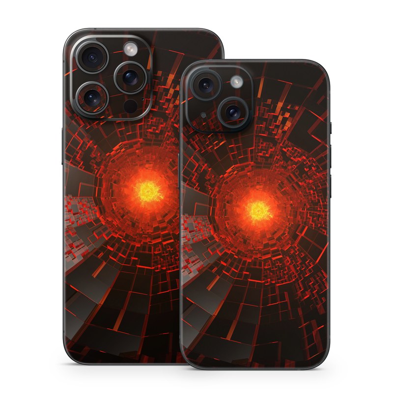 iStyles iPhone 15 Series Skin design of Red, Fractal art, Light, Circle, Design, Art, Graphics, Symmetry, Pattern, Space, with black, red colors, and tagged with patterns.