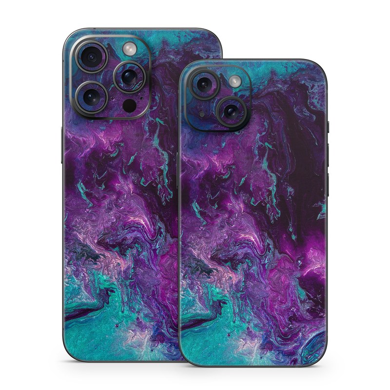 iStyles iPhone 15 Series Skin design of Blue, Purple, Violet, Water, Turquoise, Aqua, Pink, Magenta, Teal, Electric blue, with blue, purple, black colors, and tagged with abstract, space, galaxy, marbles, milkyway, nebula, space.