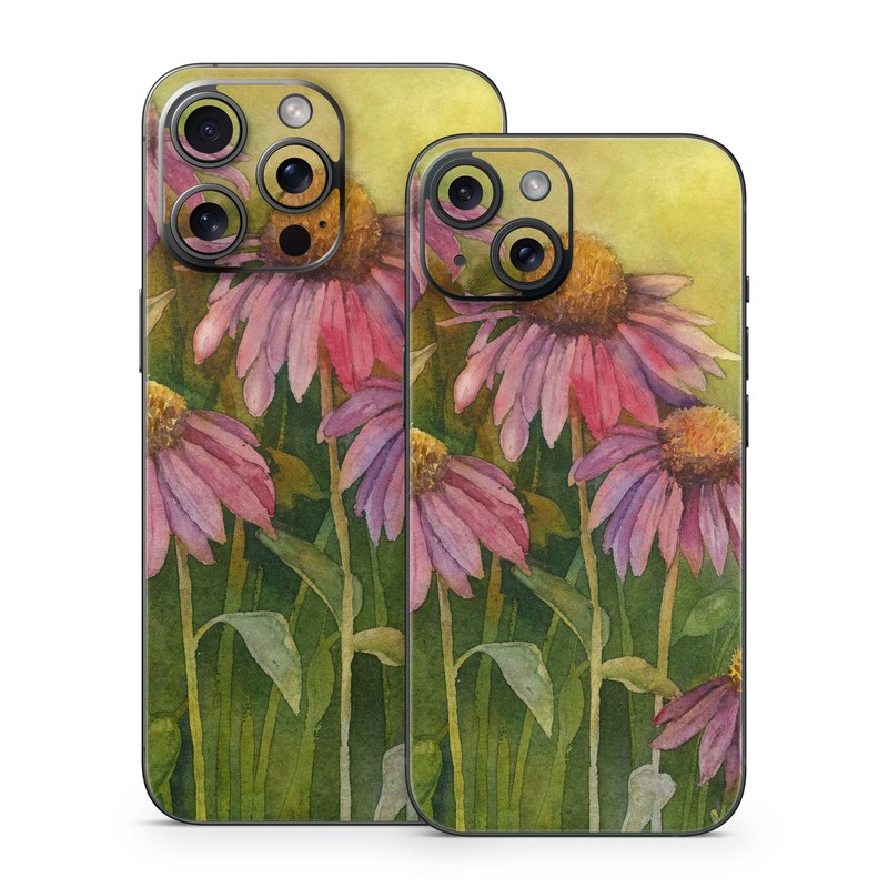 iStyles iPhone 15 Series Skin design of Flowering plant, Purple coneflower, Coneflower, Flower, Plant, Watercolor paint, Wildflower, black-eyed susan, Petal, Daisy family, with black, green, red, gray, purple colors, and tagged with flowers, fineart.