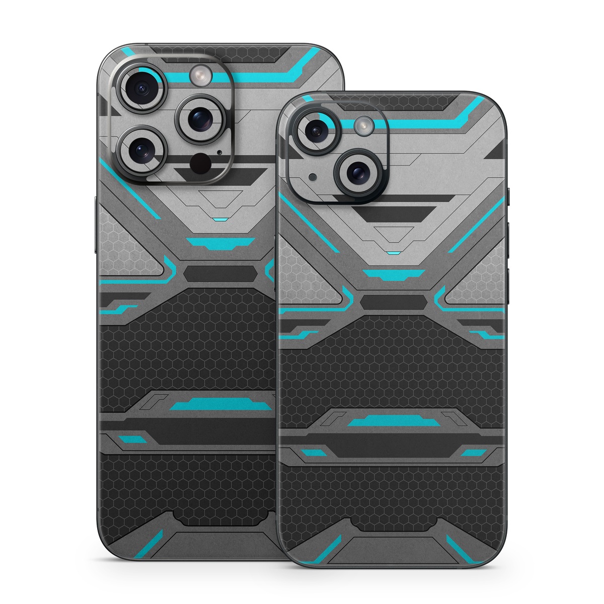 iStyles iPhone 15 Series Skin design of Blue, Turquoise, Pattern, Teal, Symmetry, Design, Line, Automotive design, Font, with black, gray, blue colors, and tagged with patterns.