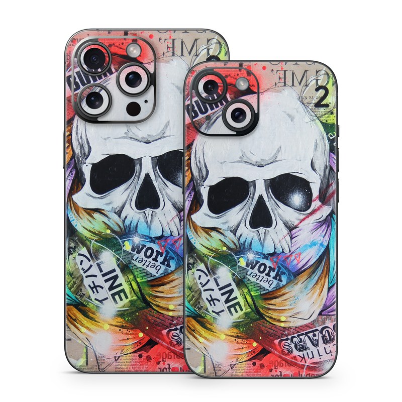 iStyles iPhone 15 Series Skin design of Street art, Text, Graphic design, Font, Illustration, Art, Graffiti, Skull, Poster, Advertising, with gray, black, red, green, blue colors, and tagged with abstract, skulls, signs.