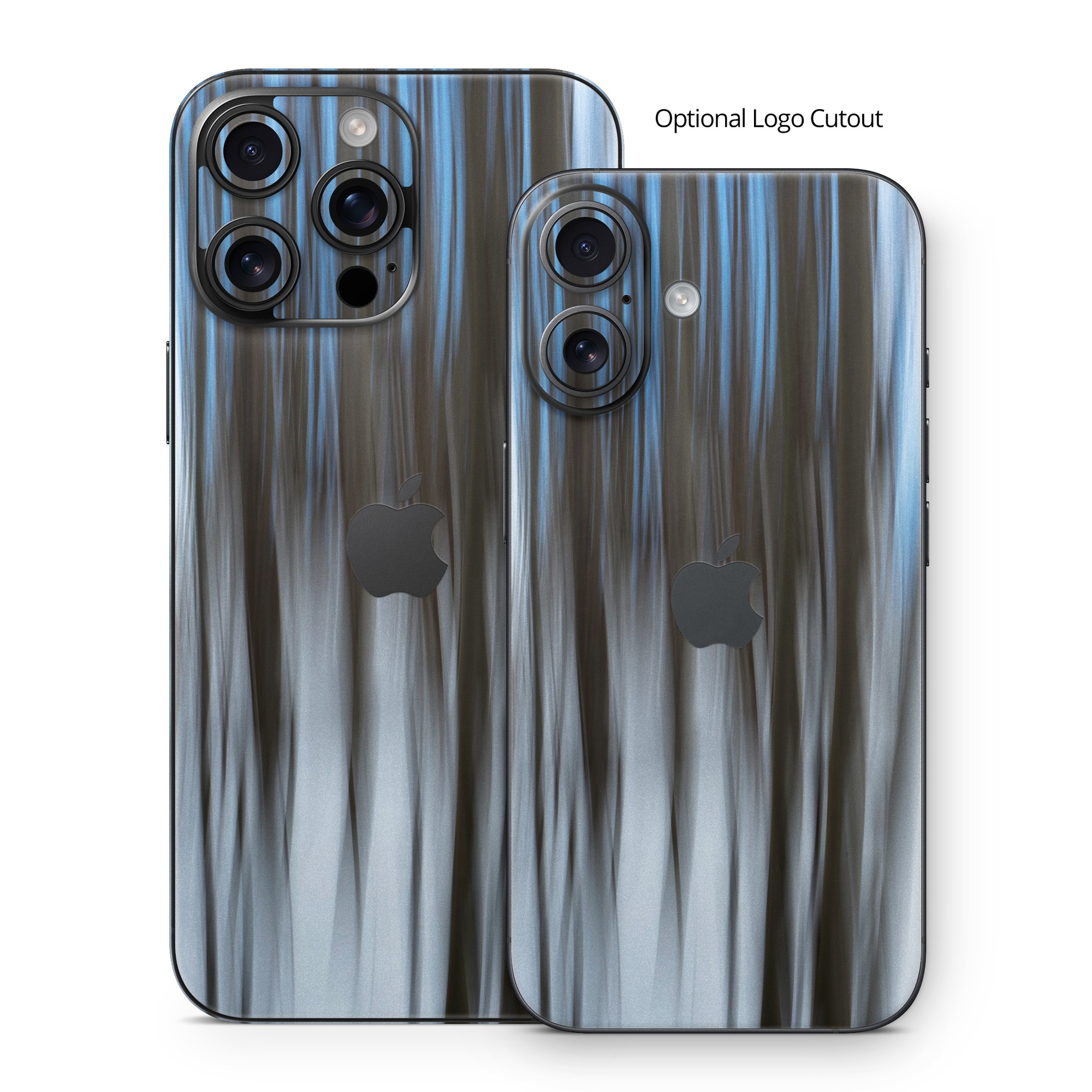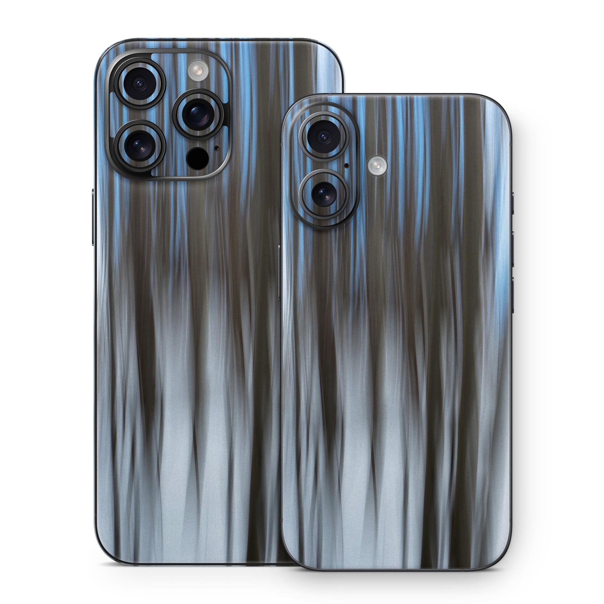 iStyles iPhone 16 Series Skin design of Water, Blue, Natural environment, Tree, Forest, Line, Waterfall, Plant, Black-and-white, Reflection, with black, white, blue colors, and tagged with patterns, abstract, nature, photos, abstract, forest, lines, nature, photo, photography, shapes, trees.