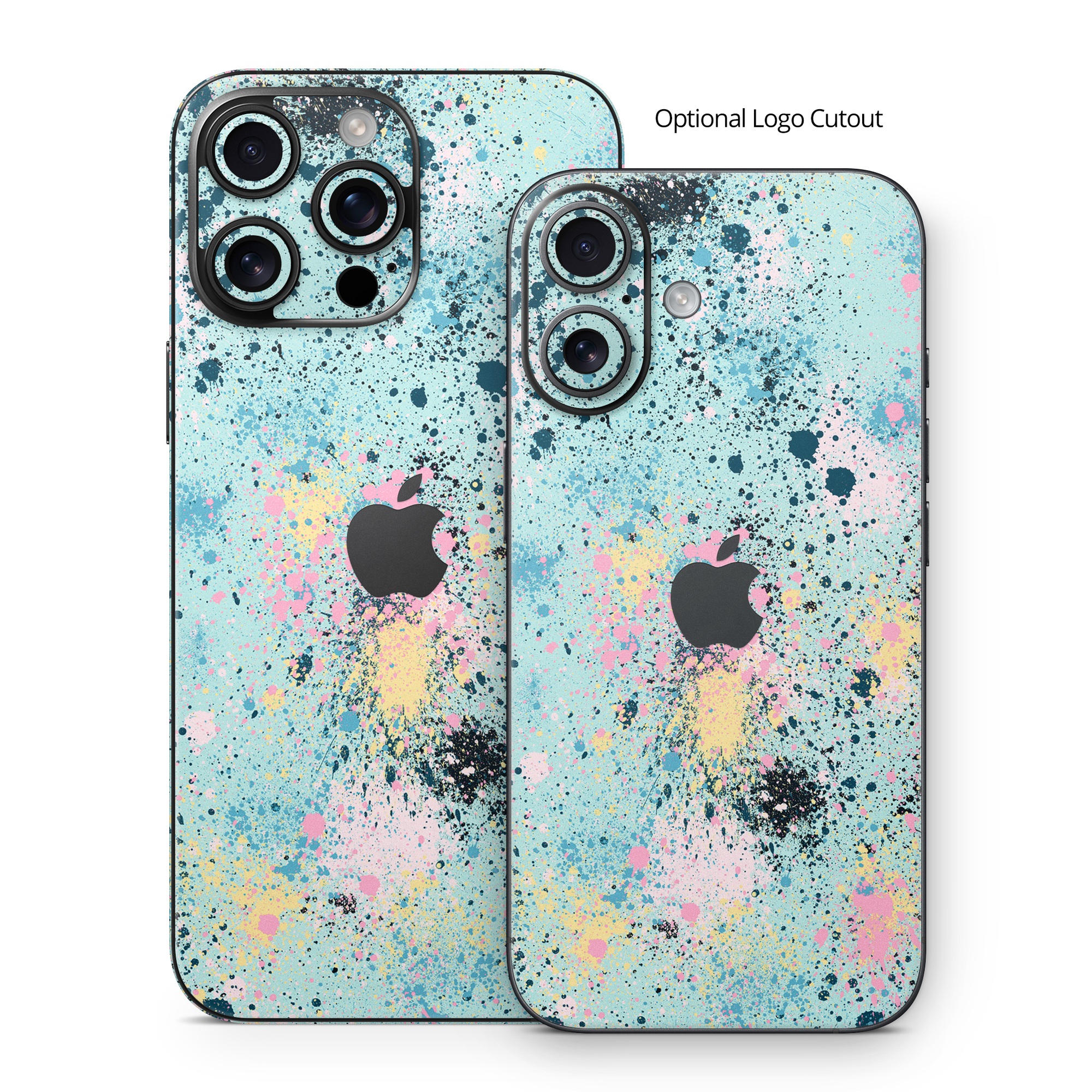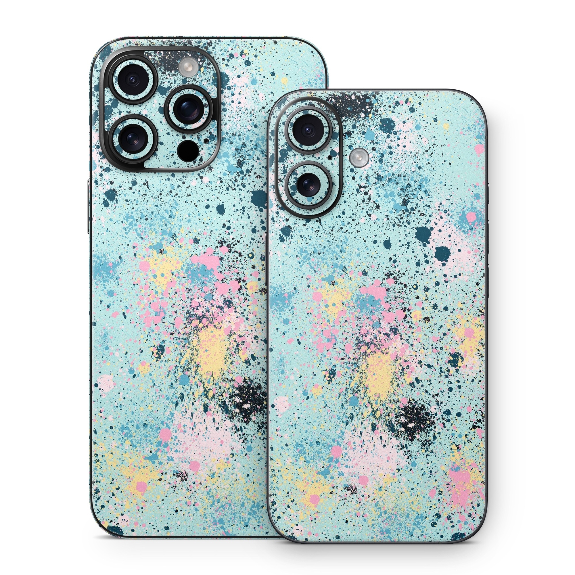 iStyles iPhone 16 Series Skin design of Colorfulness, Art, Paint, Aqua, Art paint, Pattern, Tints and shades, Magenta, Electric blue, Creative arts, with blue, black, pink, yellow colors, and tagged with patterns, abstract, blue, collage, ink, paint, pink, splatter, yellow.