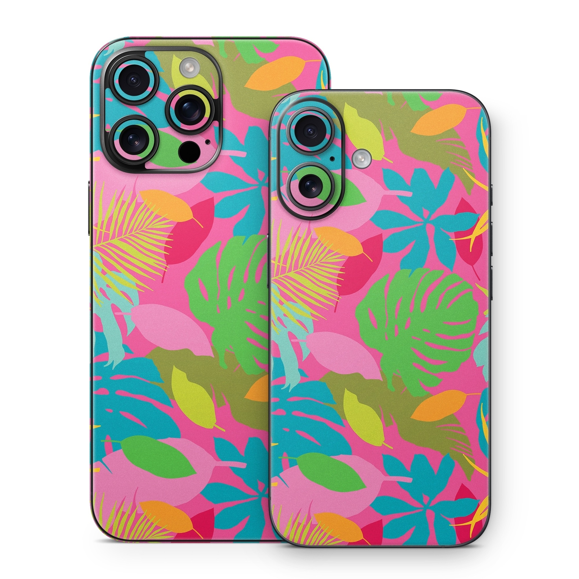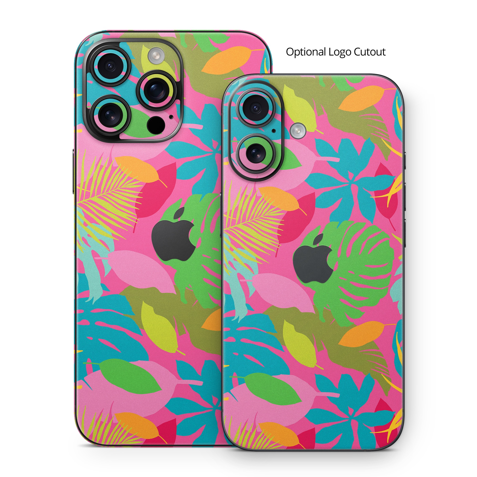 iStyles iPhone 16 Series Skin design of Organism, Pink, Rectangle, Magenta, Aqua, Art, Symmetry, Pattern, Painting, Electric blue, with pink, green, blue, yellow, orange, red colors, and tagged with patterns, flowers, nature, blue, green, leaf, leaves, orange, palmtree, palms, pink, tropic, tropical, tropics, yellow.