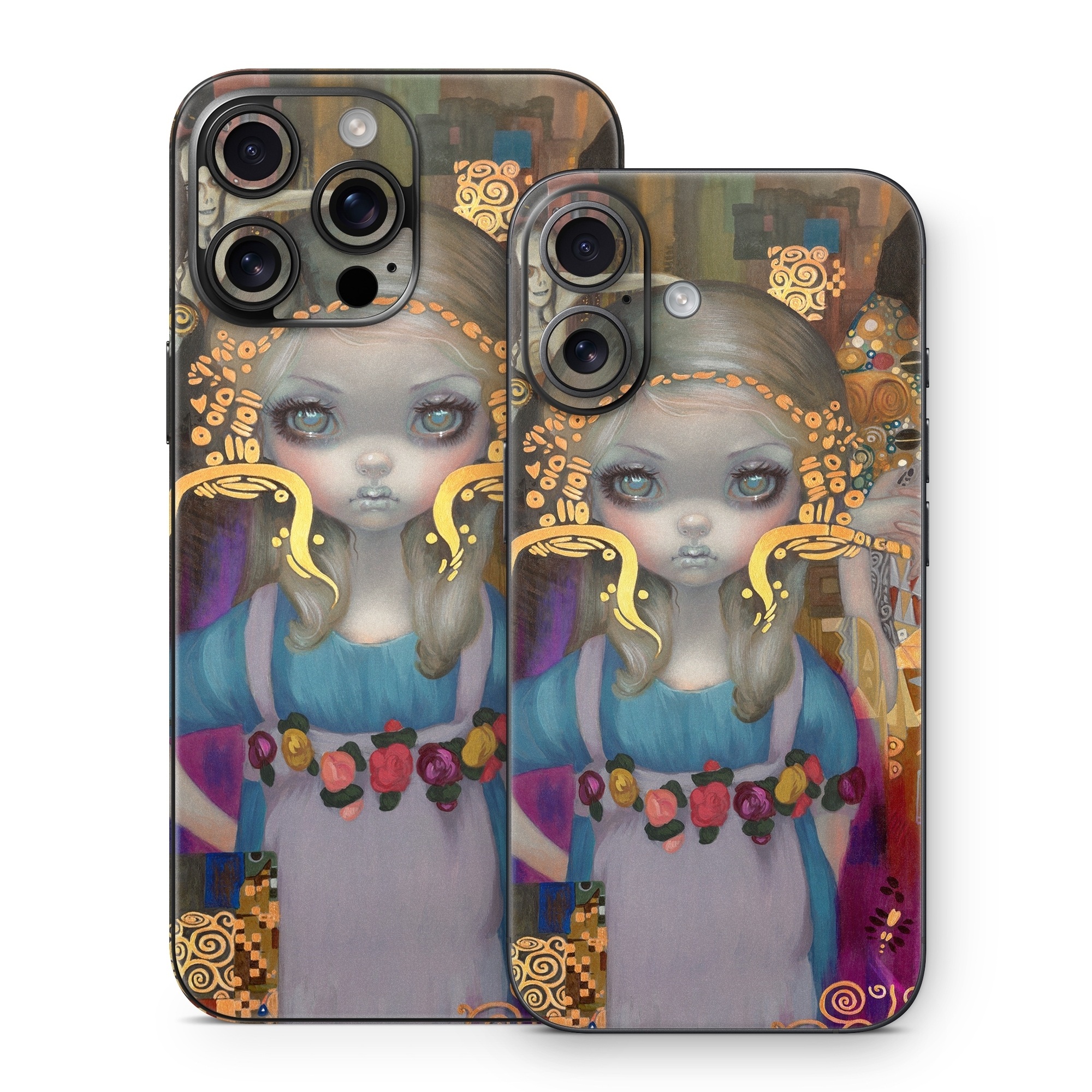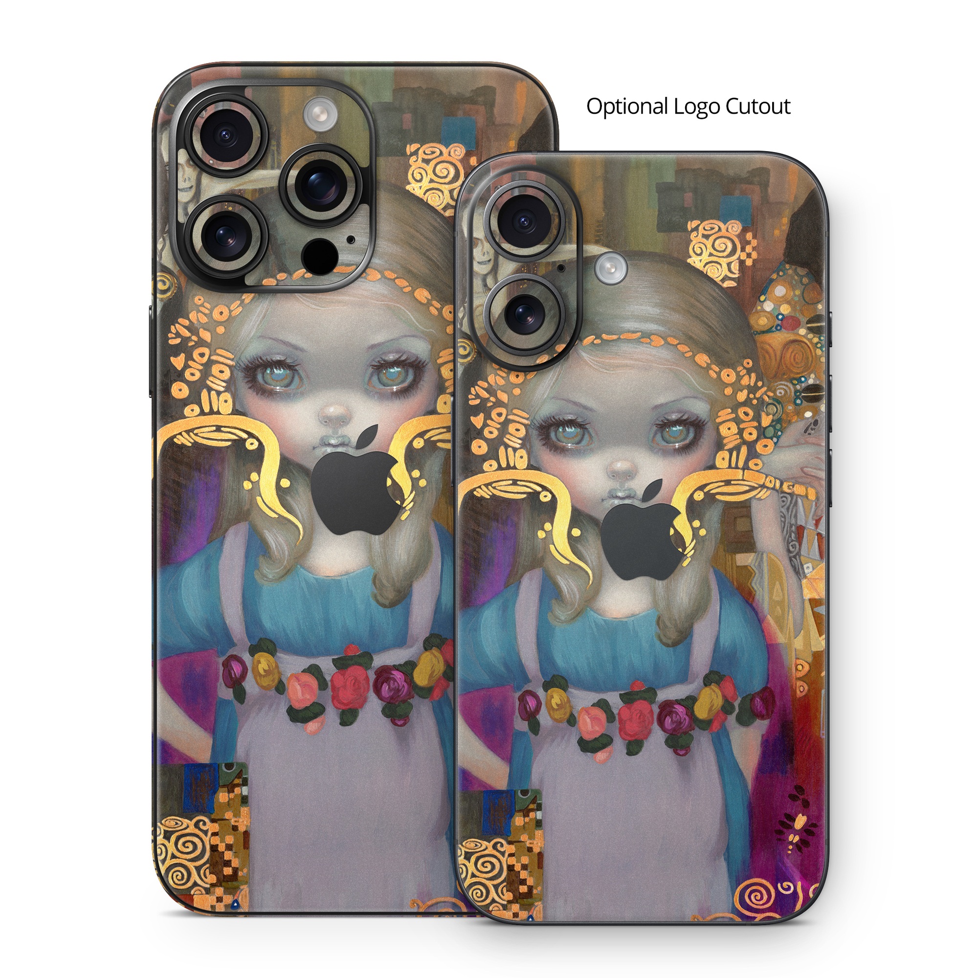 iStyles iPhone 16 Series Skin design of Art, Temple, Painting, Architecture, Visual arts, Illustration, with yellow, orange, pink, purple, red, brown colors, and tagged with people, fantasy, animals, patterns, flowers, alice, artist, klimt, wonderland.