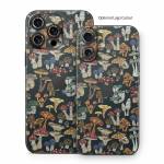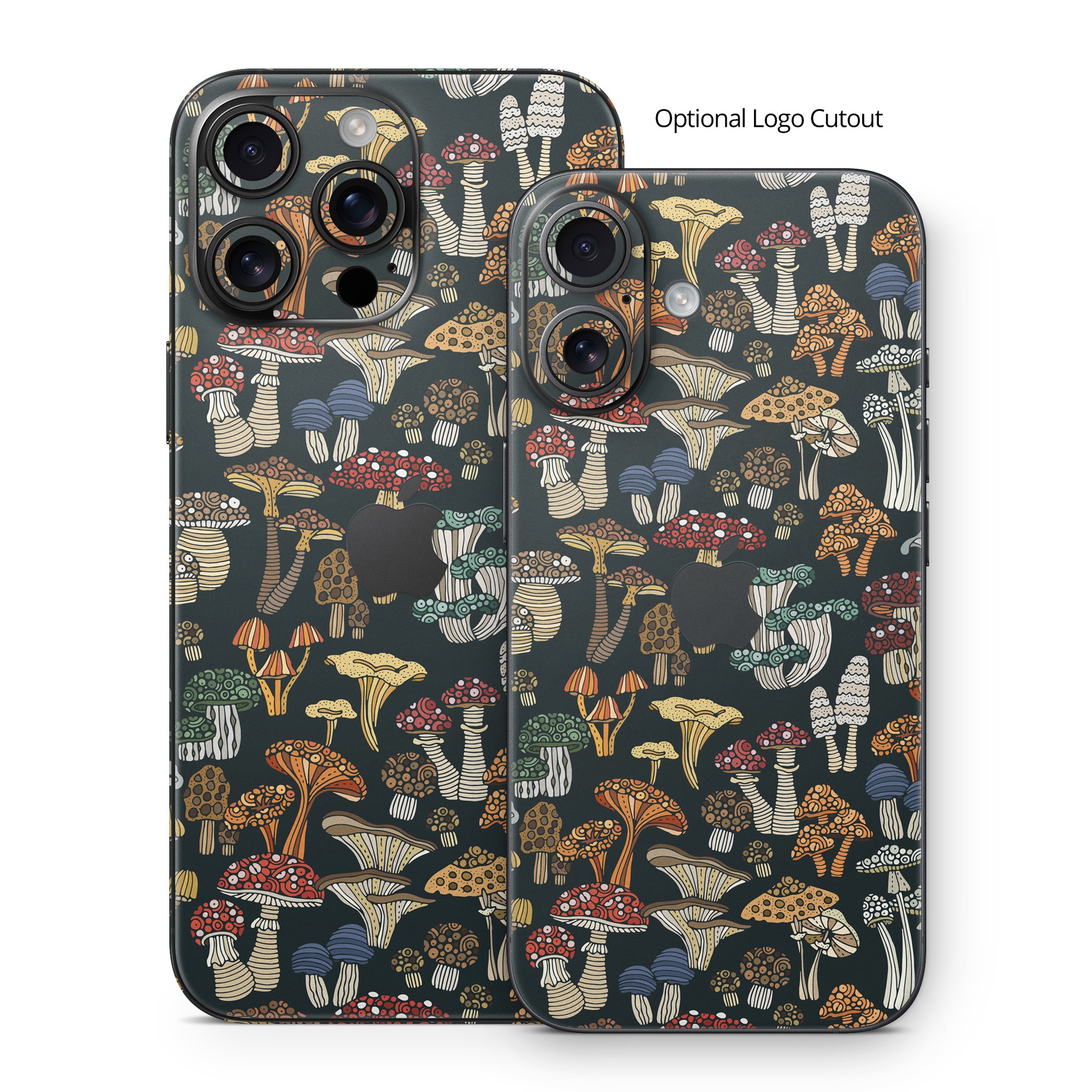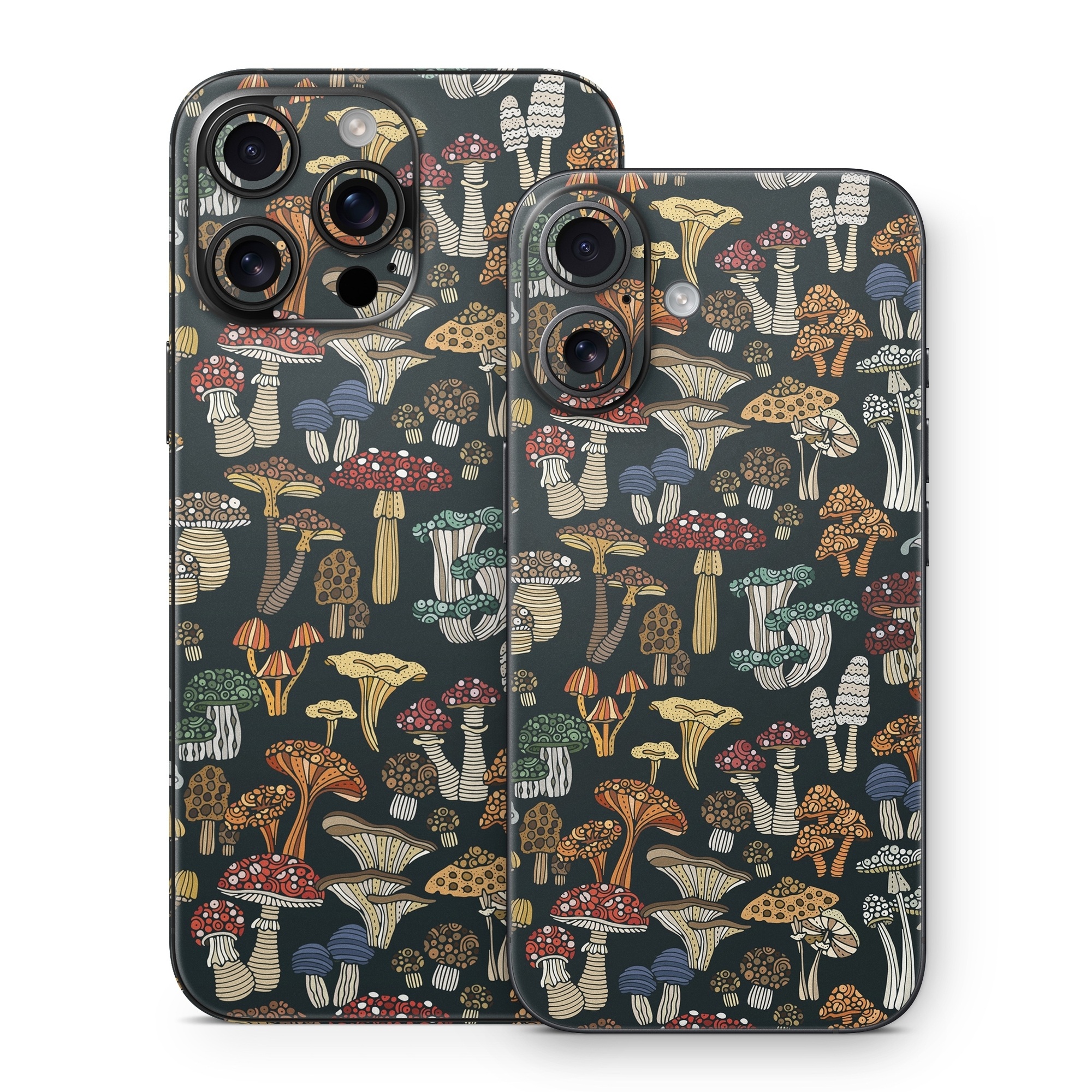 iStyles iPhone 16 Series Skin design of Brown, Textile, Sleeve, Art, Font, Pattern, Collage, Painting, Illustration, Event, with black, white, blue, red, yellow, orange colors, and tagged with patterns, objects, fungi, mushrooms, pattern.