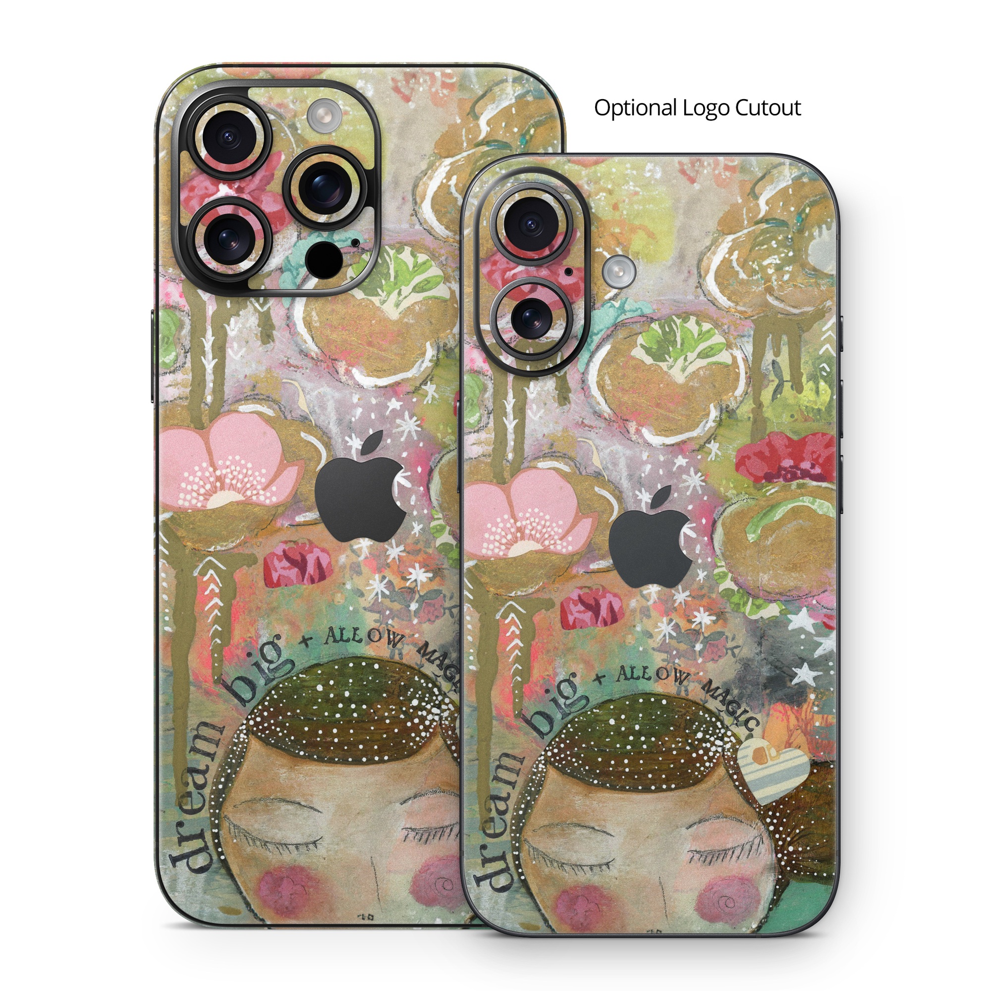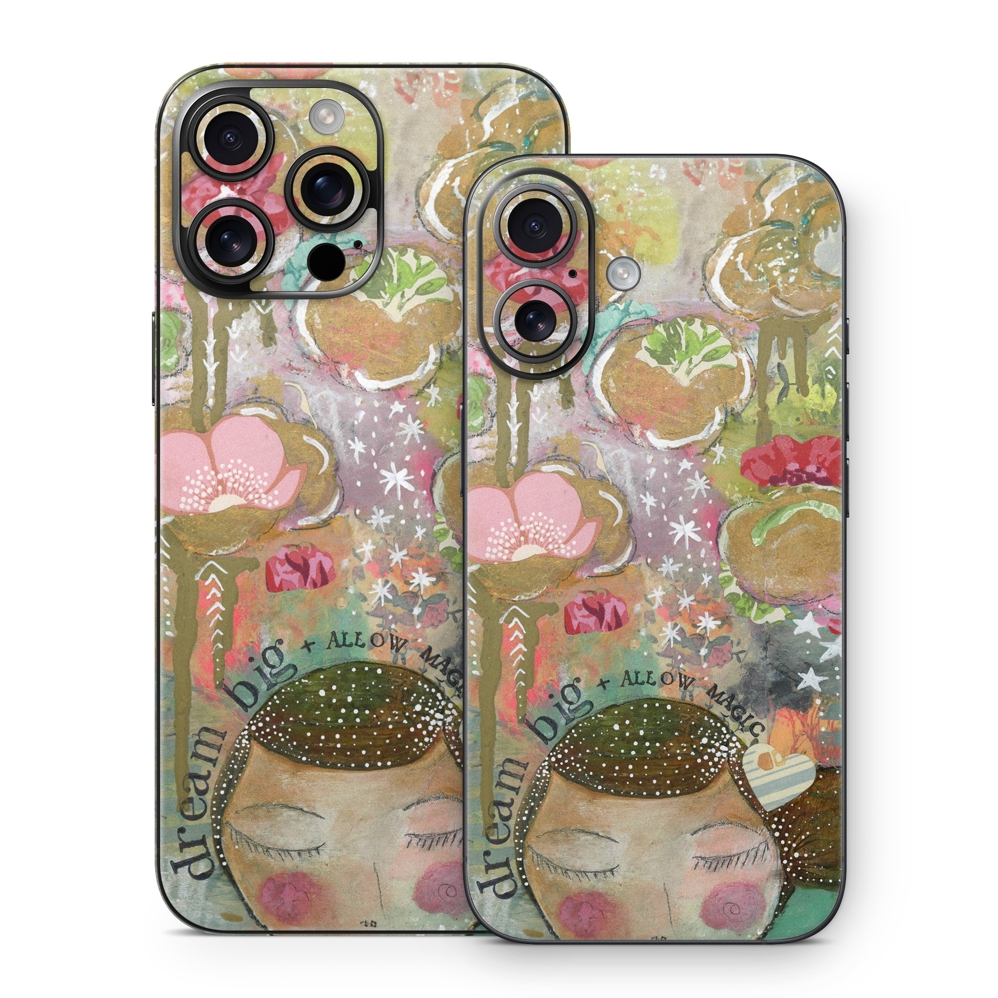 iStyles iPhone 16 Series Skin design of Painting, Pink, Illustration, Art, Child art, Watercolor paint, Drawing, Visual arts, Still life, with brown, pink, red, green, white, black, orange, gray colors, and tagged with flowers, signs, people, dream, flowers, magic, nature, painting.