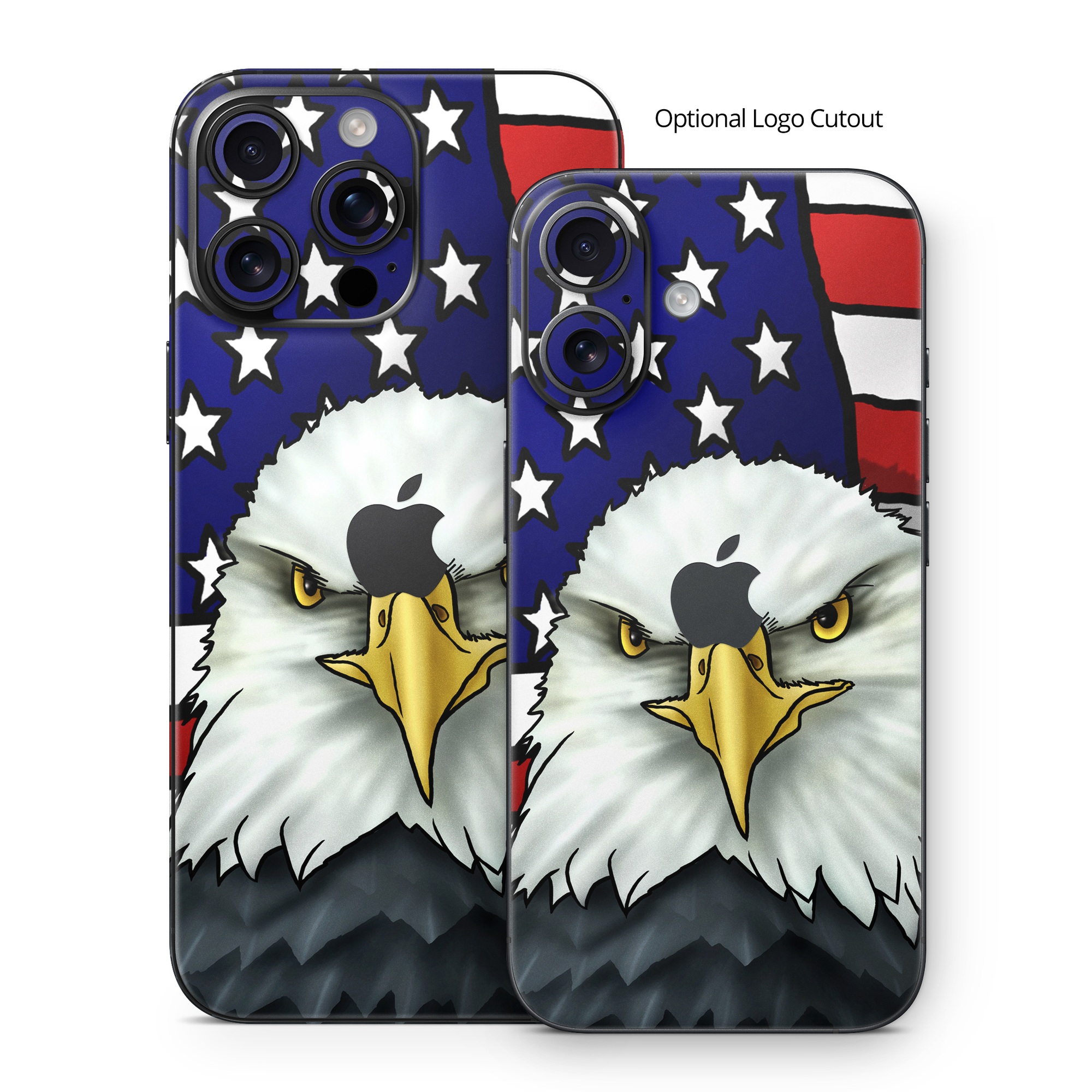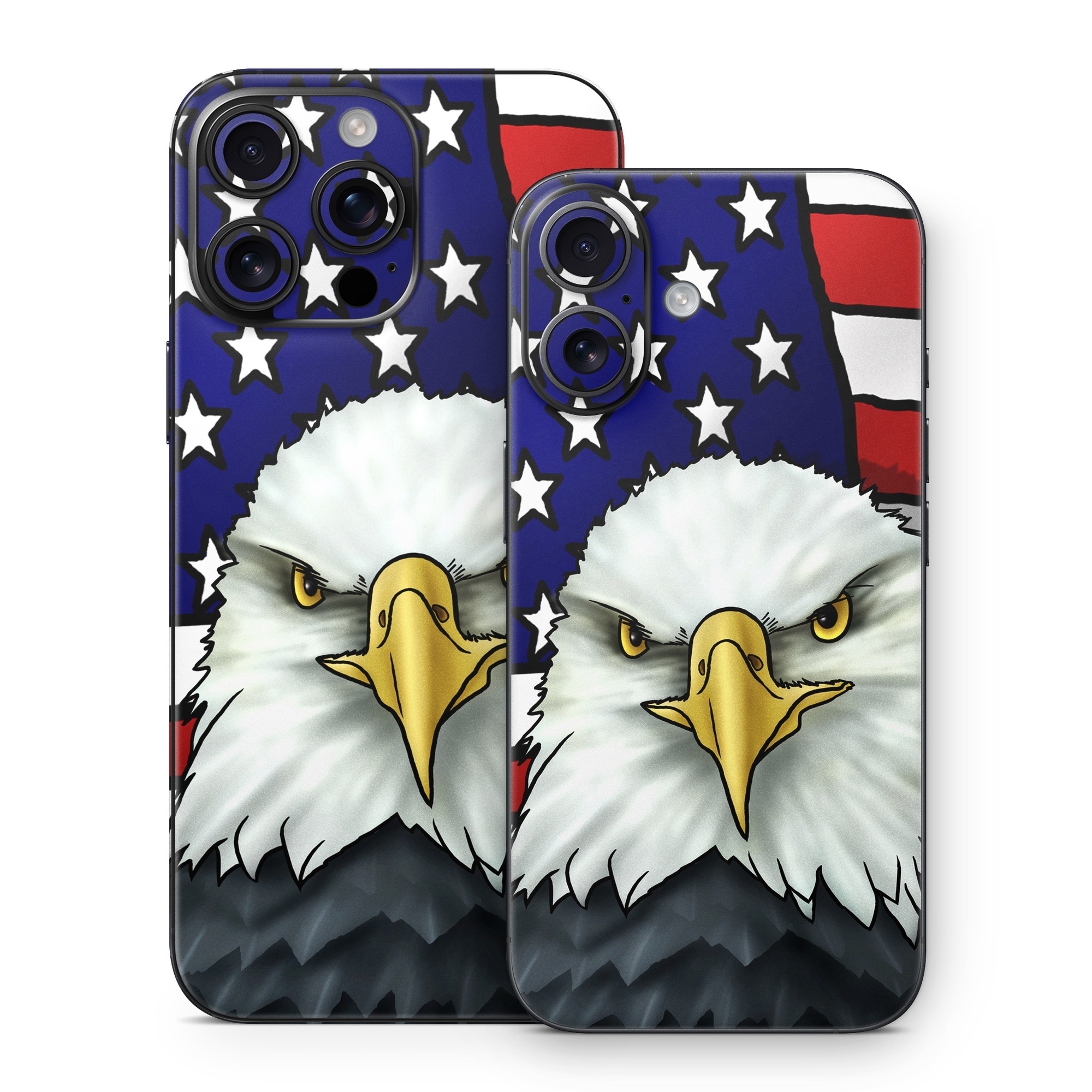iStyles iPhone 16 Series Skin design of Bald eagle, Eagle, Bird, Bird of prey, Accipitridae, Beak, Accipitriformes, Sea eagle, Flag, with white, gray, blue, yellow, red colors, and tagged with flags, animals.