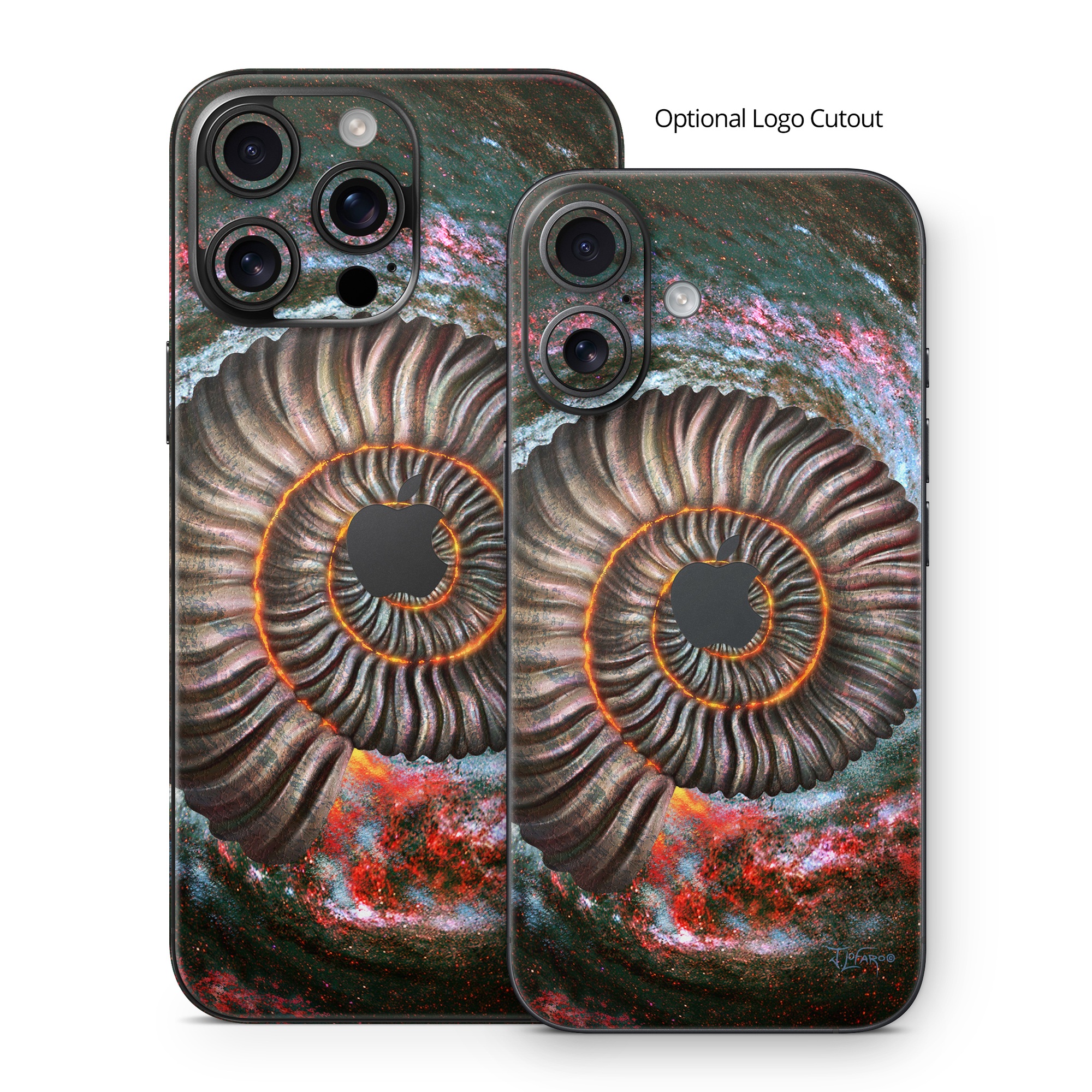 iStyles iPhone 16 Series Skin design of Spiral, Fractal art, Vortex, Circle, Art, Ammonoidea, with black, brown, red, white, blue, green colors, and tagged with animals, patterns, space, celestial, galactic, galaxy, outerspace, sci-fi.