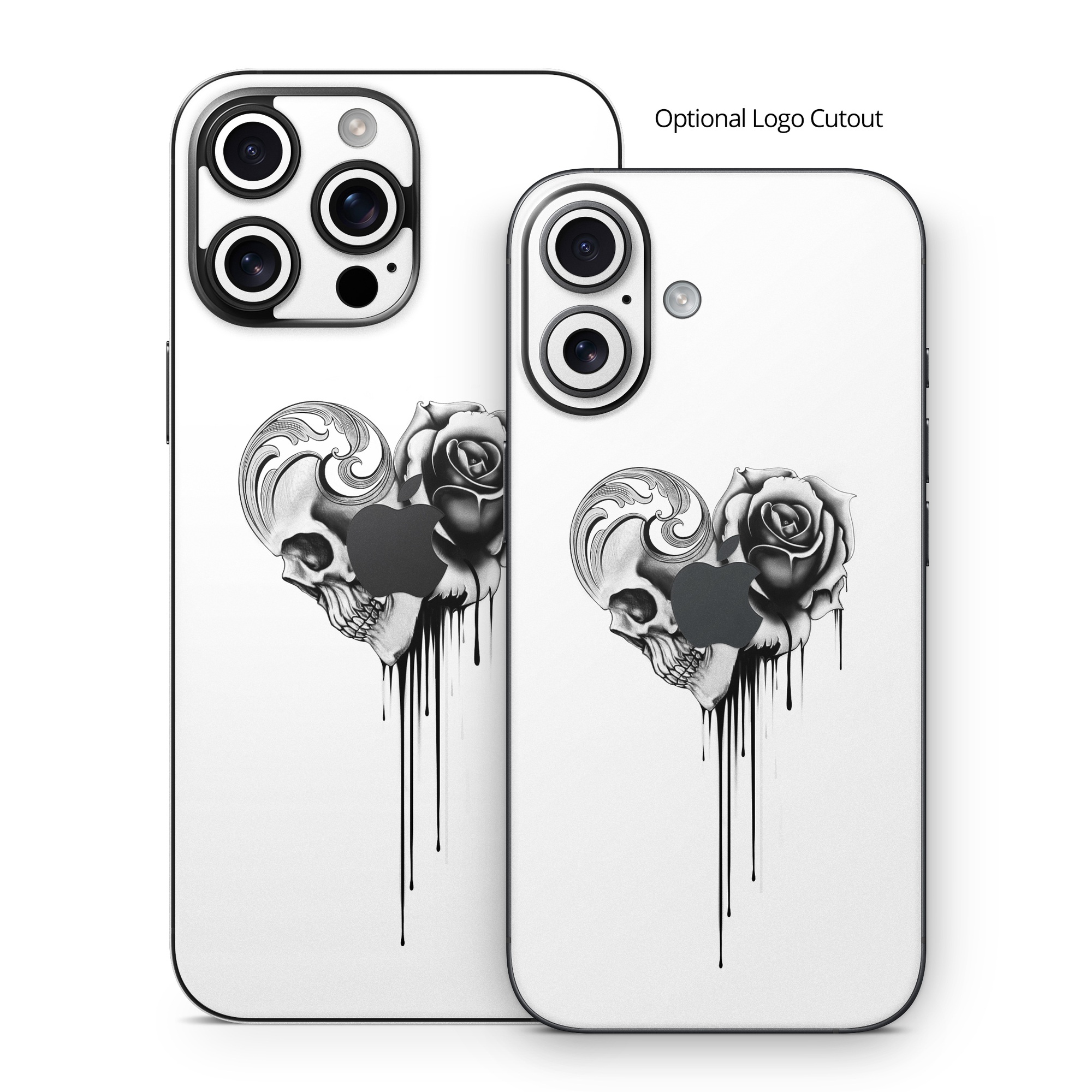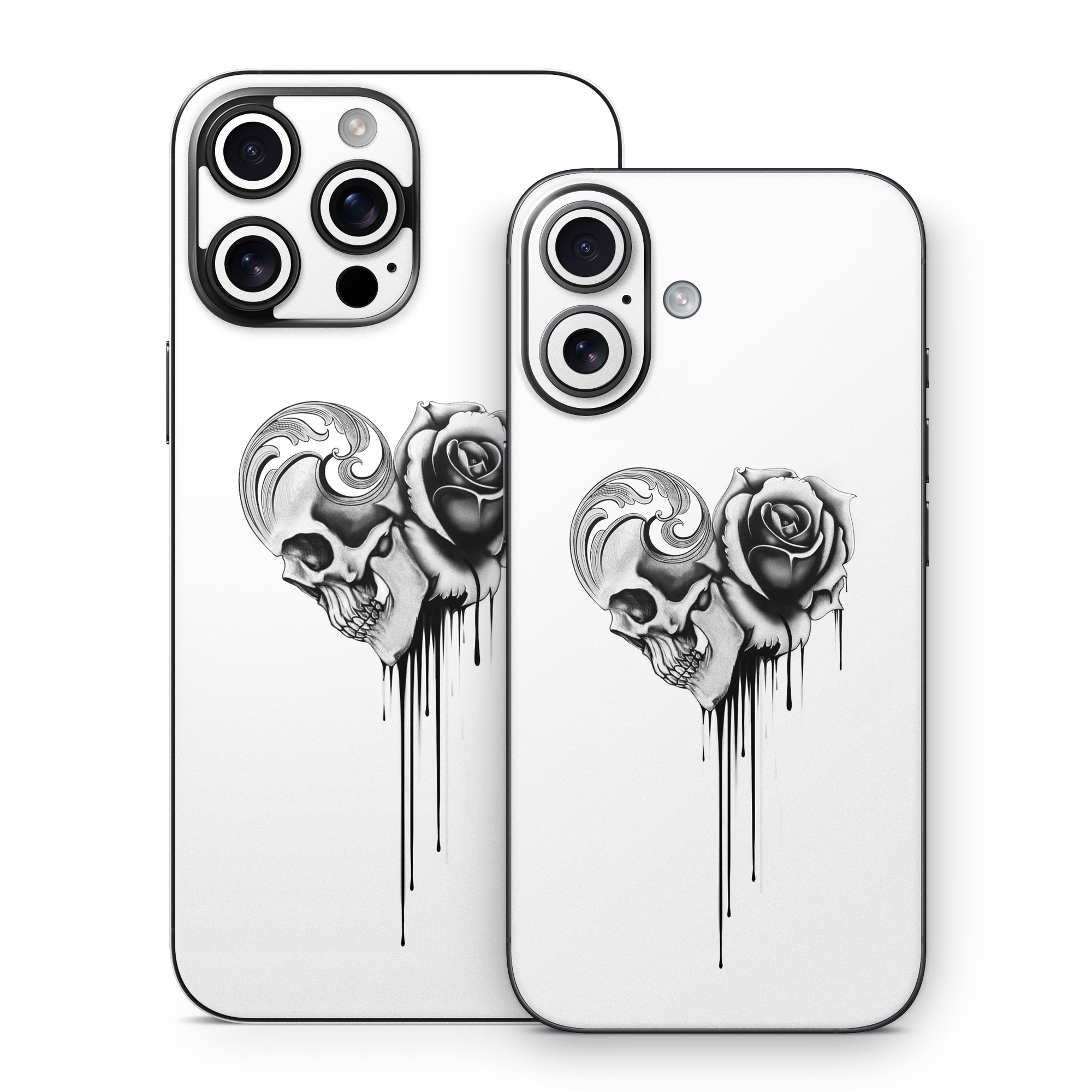 iStyles iPhone 16 Series Skin design of Black-and-white, Illustration, Monochrome, Rose, Plant, Style, Metal, Drawing, with white, black, gray colors, and tagged with hearts, flowers, skulls, goth, gothic, heart, ink, inkpen, rose, sketch, skull.