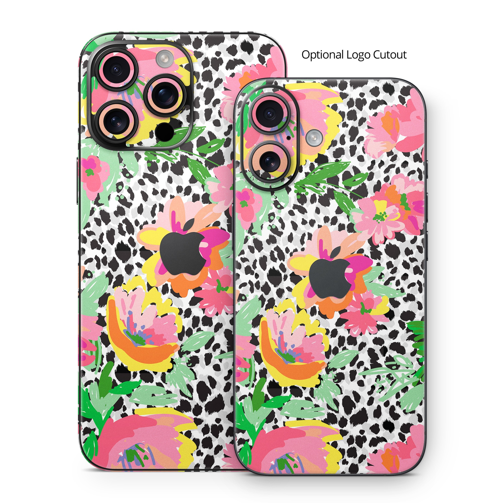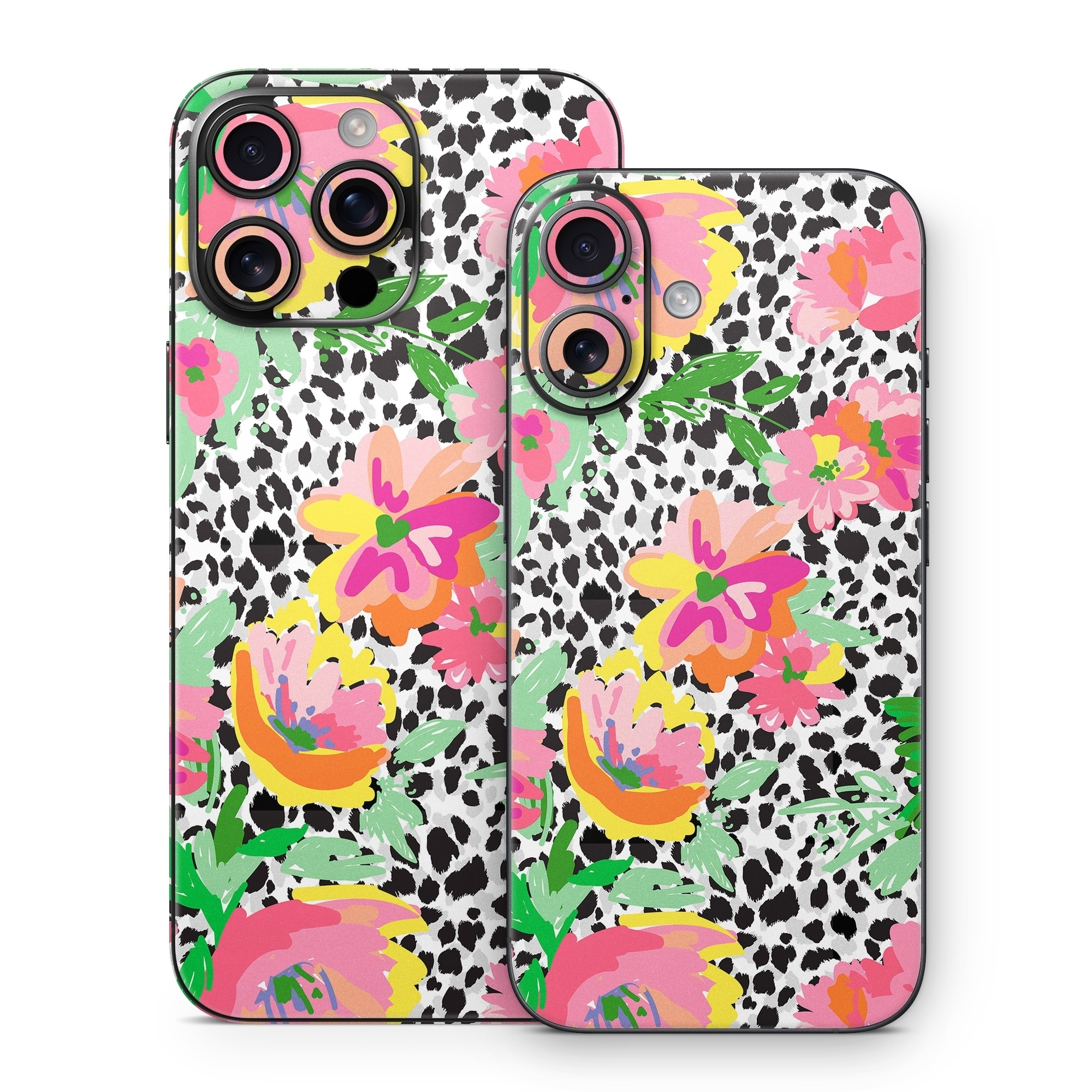 iStyles iPhone 16 Series Skin design of Flower, Petal, Textile, Pink, Creative arts, Art, Magenta, Pattern, Plant, Symmetry, with pink, orange, yellow, purple, green, black, white colors, and tagged with patterns, flowers, flowers, leaves, arrangement.