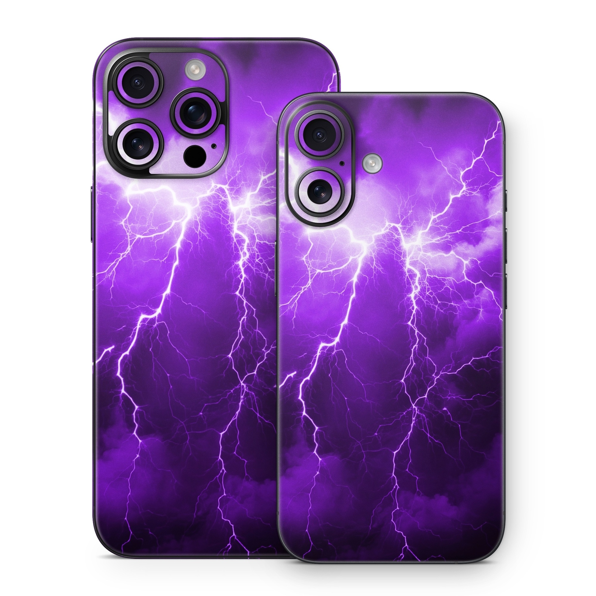 iStyles iPhone 16 Series Skin design of Sky, Lightning, Thunder, Atmosphere, Thunderstorm, Daytime, Purple, Light, Cloud, Nature, with black, purple colors, and tagged with patterns, nature, lightning, sky, thunderstorm, storm, electricity.