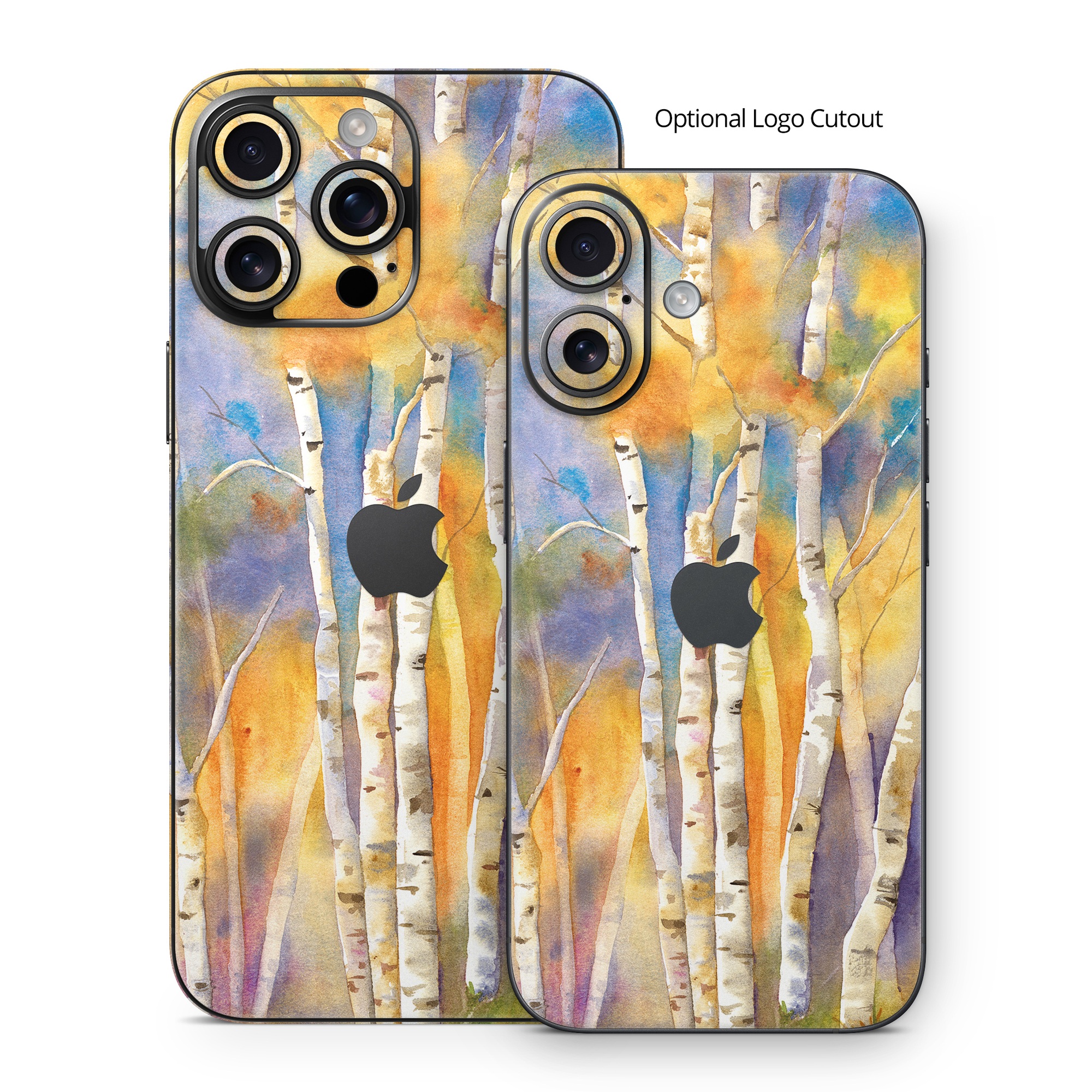 iStyles iPhone 16 Series Skin design of Canoe birch, Watercolor paint, Tree, Birch, Woody plant, Painting, Plant, Birch family, Paint, Trunk, with orange, yellow, green, white, purple, blue colors, and tagged with nature.
