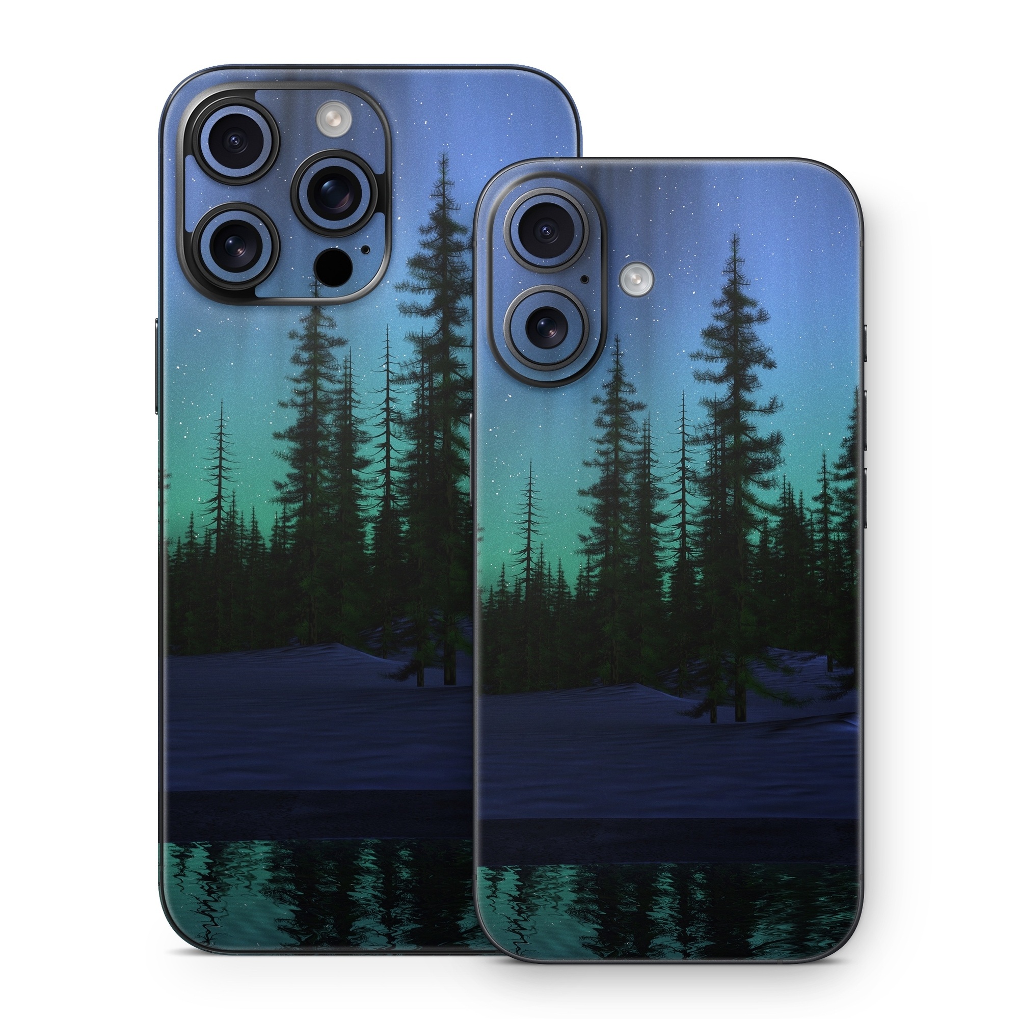 iStyles iPhone 16 Series Skin design of Aurora, Nature, Sky, shortleaf black spruce, Natural landscape, Tree, Wilderness, Natural environment, Biome, Spruce-fir forest, with blue, purple, green, black colors, and tagged with nature, photos.