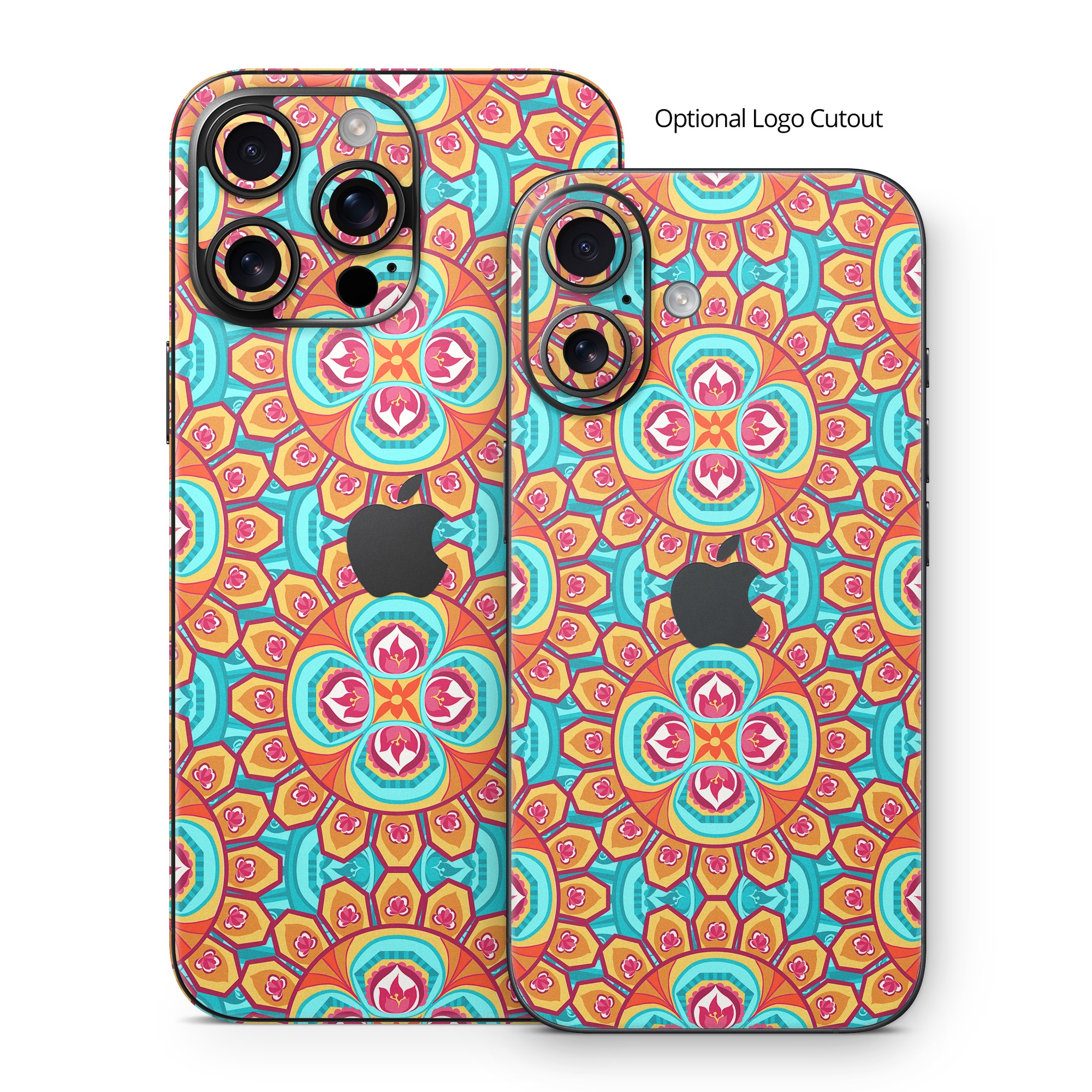 iStyles iPhone 16 Series Skin design of Pattern, Orange, Design, Textile, Wrapping paper, Visual arts, Motif, Circle, Art, with blue, orange, red, yellow colors, and tagged with patterns, flowers.