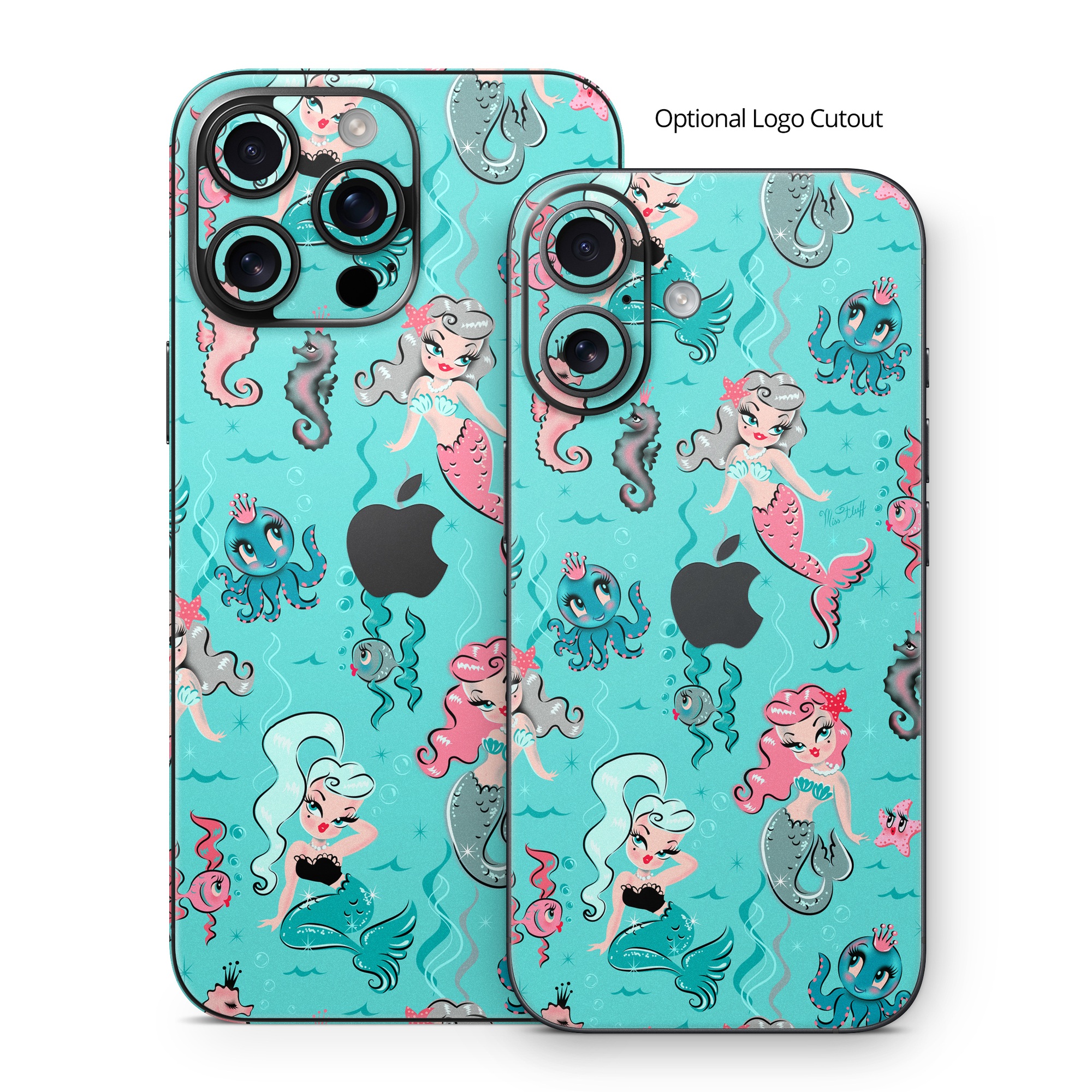 iStyles iPhone 16 Series Skin design of Turquoise, Wrapping paper, Cartoon, Pattern, Textile, Aqua, Design, Gift wrapping, Illustration, Fictional character, with blue, pink, yellow, gray colors, and tagged with patterns, animals, people, fantasy, mermaid, mermaids, mystical, ocean, pastel, pattern, pinup, pinupgirl, sea, sealife.