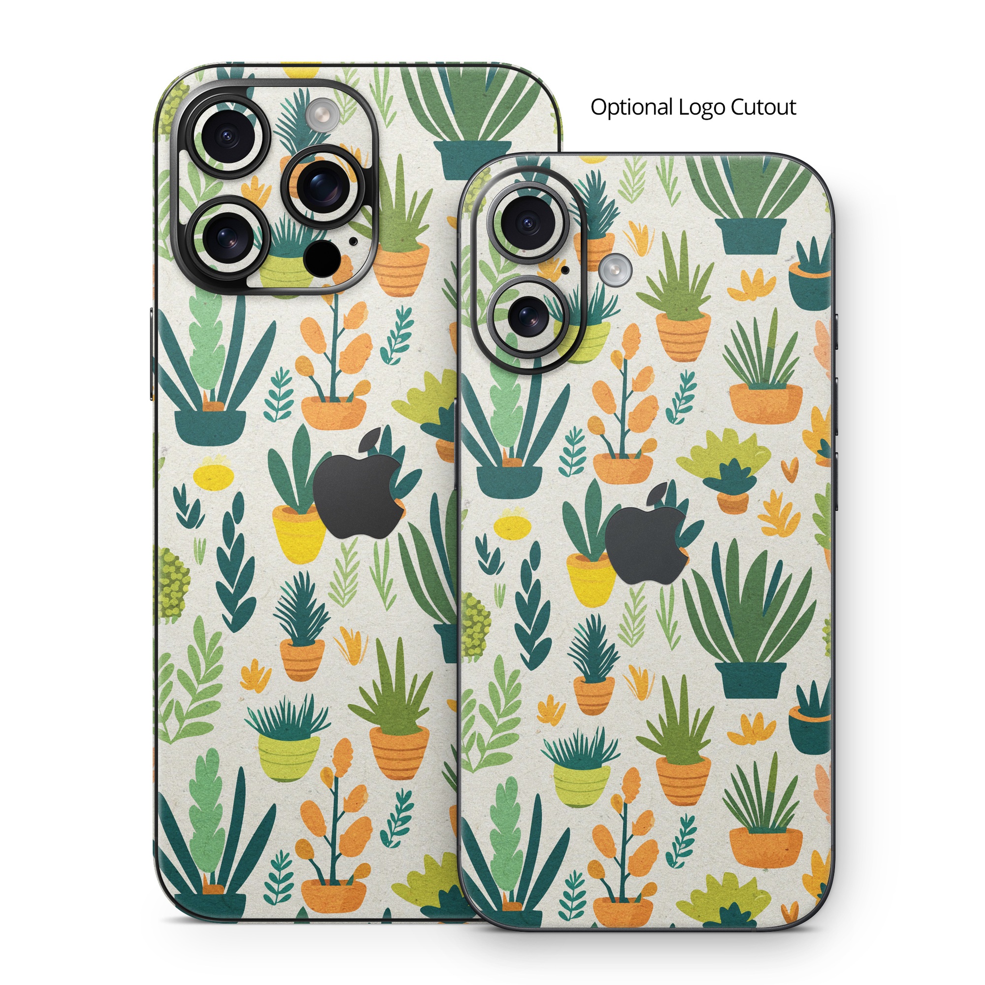 iStyles iPhone 16 Series Skin design of Flower, Plant, Petal, Textile, Botany, Art, Creative arts, Flowering plant, Porcelain, Groundcover, with white, green, brown, yellow, orange colors, and tagged with patterns, objects, nature, plants, pots, gardening, pattern.
