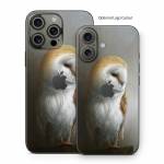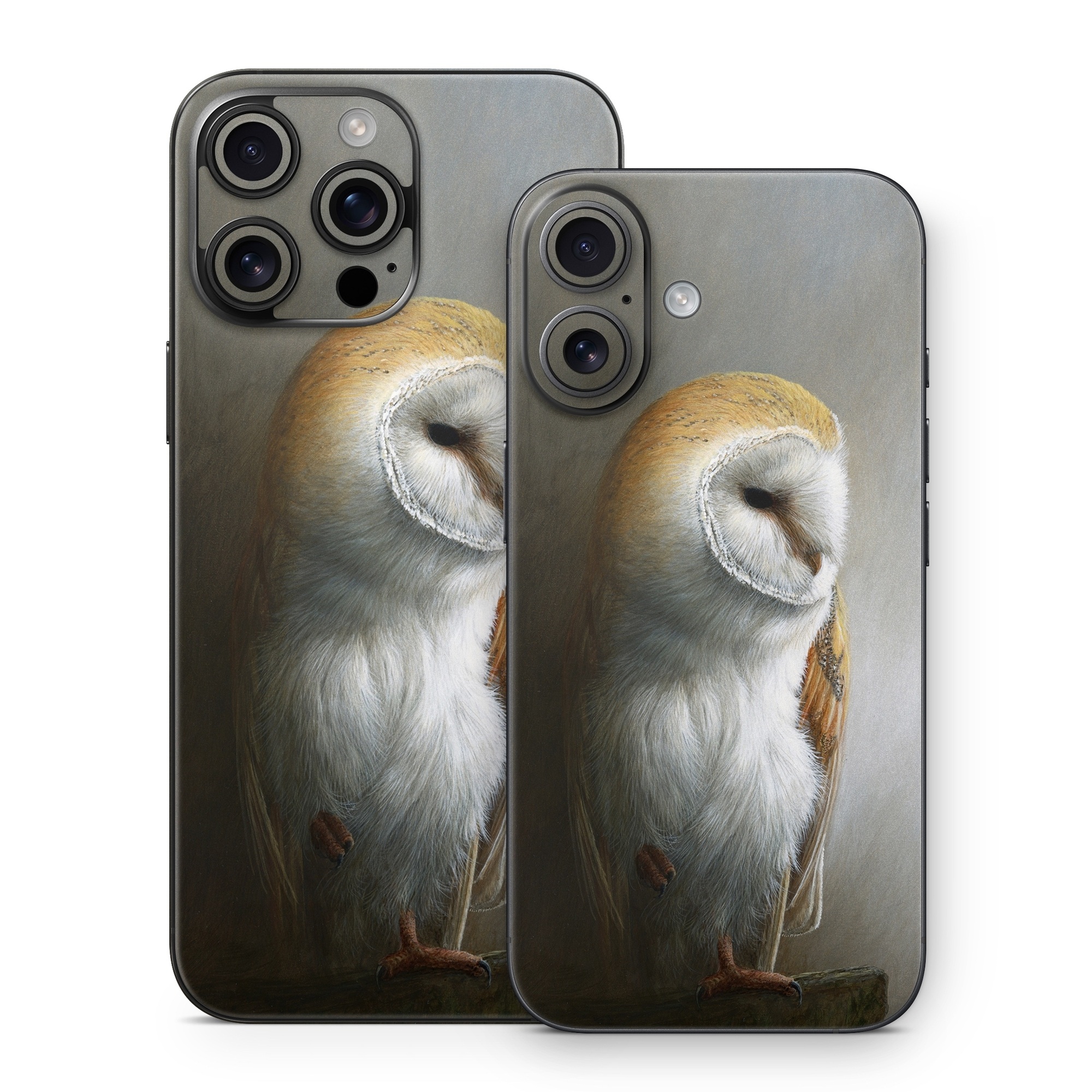 iStyles iPhone 16 Series Skin design of Barn owl, Owl, Bird, Bird of prey, Beak, Wildlife, with yellow, white, orange, brown colors, and tagged with animals.