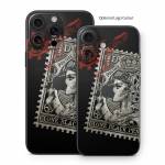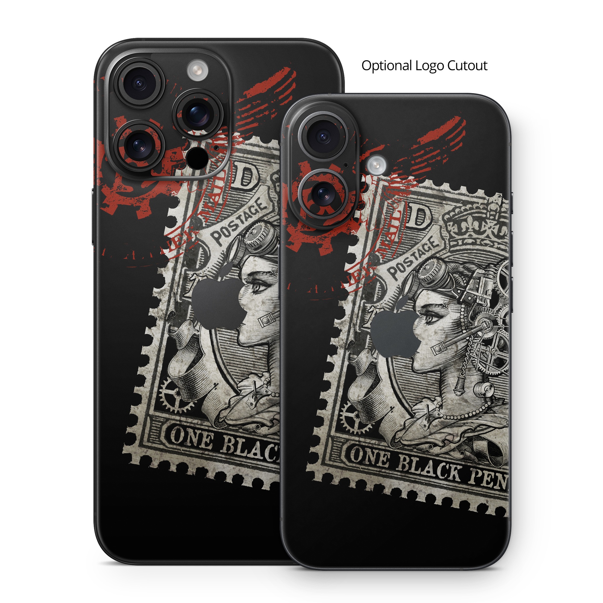 iStyles iPhone 16 Series Skin design of Font, Postage stamp, Illustration, Drawing, Art, with black, gray, red colors, and tagged with people, objects, signs.