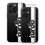 iStyles iPhone 16 Series Skin design of Font, Tints and shades, Rectangle, Electric blue, Logo, Brand, Graphics, Pattern, Darkness, Monochrome photography, with black, white colors, and tagged with signs, lookslike, turbo, racecar.