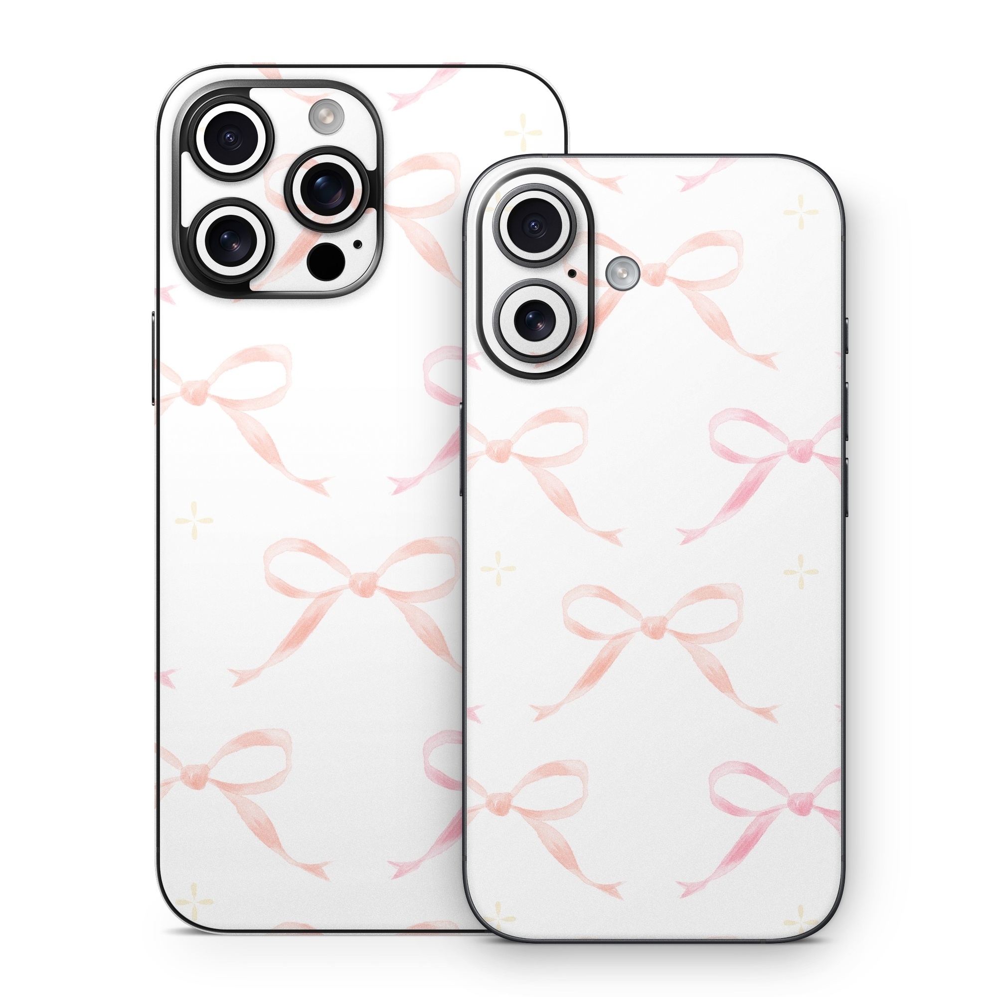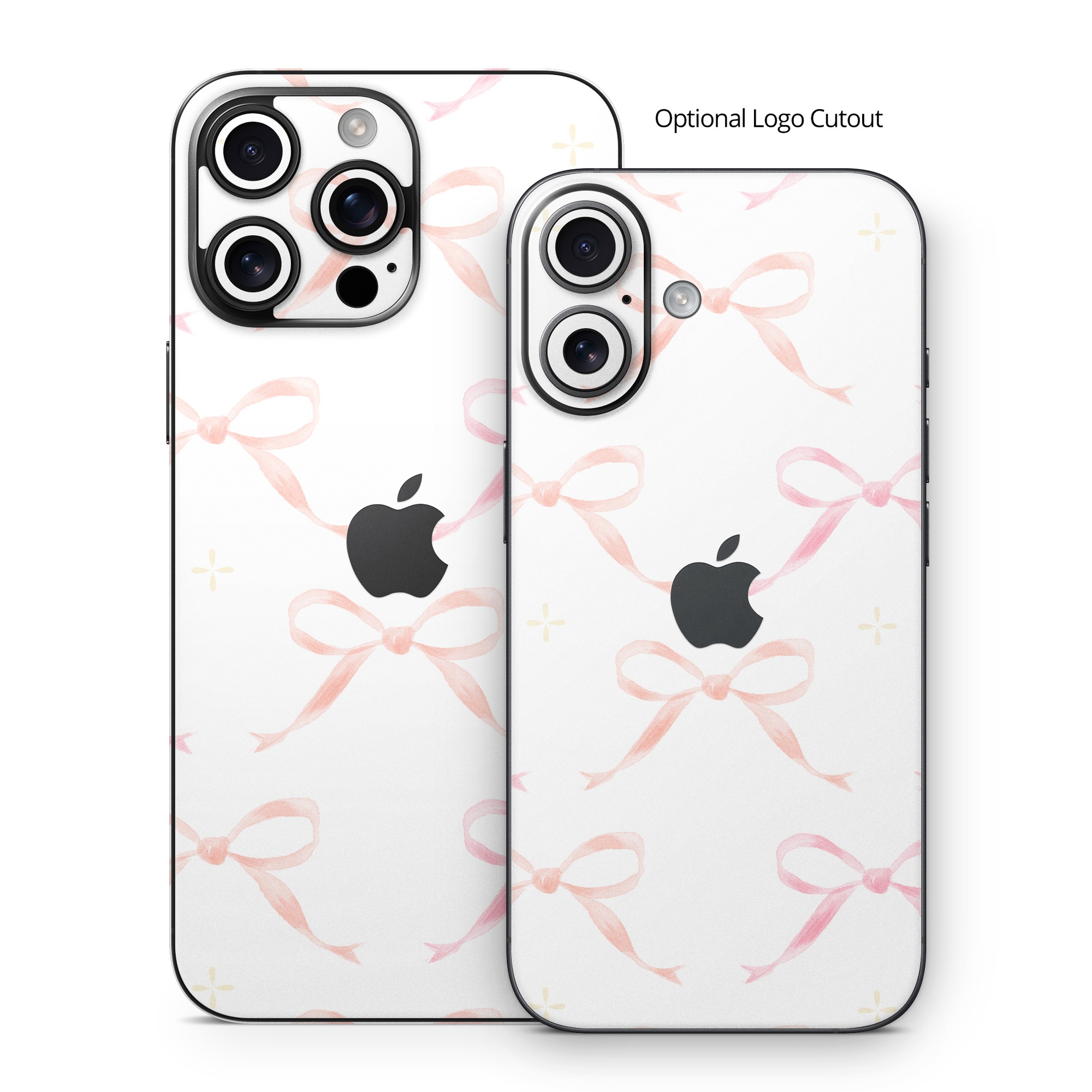 iStyles iPhone 16 Series Skin design of Textile, Rectangle, Pink, Motif, Font, Magenta, Symmetry, Pattern, Art, Peach, with white, pink, orange colors, and tagged with patterns, objects, ribbon, showlace, pretty.