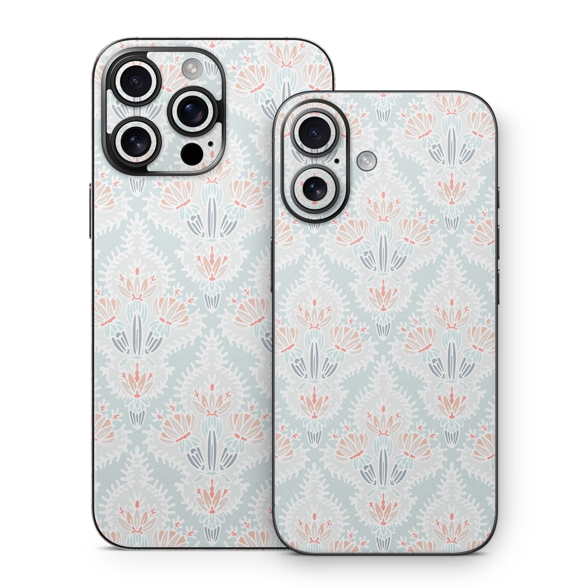 iStyles iPhone 16 Series Skin design of Pattern, Aqua, Line, Design, Textile, Wrapping paper, Pedicel, Dahlia, Visual arts, with blue, red, white colors, and tagged with patterns, flowers, cactus, floral, flowers, pattern, soft.