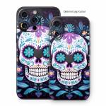 iStyles iPhone 16 Series Skin design of Textile, Petal, Aqua, Art, Symmetry, Flower, Pattern, Circle, Magenta, Electric blue, with yellow, orange, red, black, white, blue, purple colors, and tagged with skulls, flowers, halloween, flowers, skull, leaves.