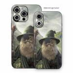 iStyles iPhone 16 Series Skin design of Beard, Facial hair, Illustration, Mythology, Magician, Fictional character, Cg artwork, Games, Art, with green, gray, brown, blue, green, white, yellow, black colors, and tagged with animals, fantasy, objects, cat, fantasy, middleearth, movie, movies, wizard, hat, staff.