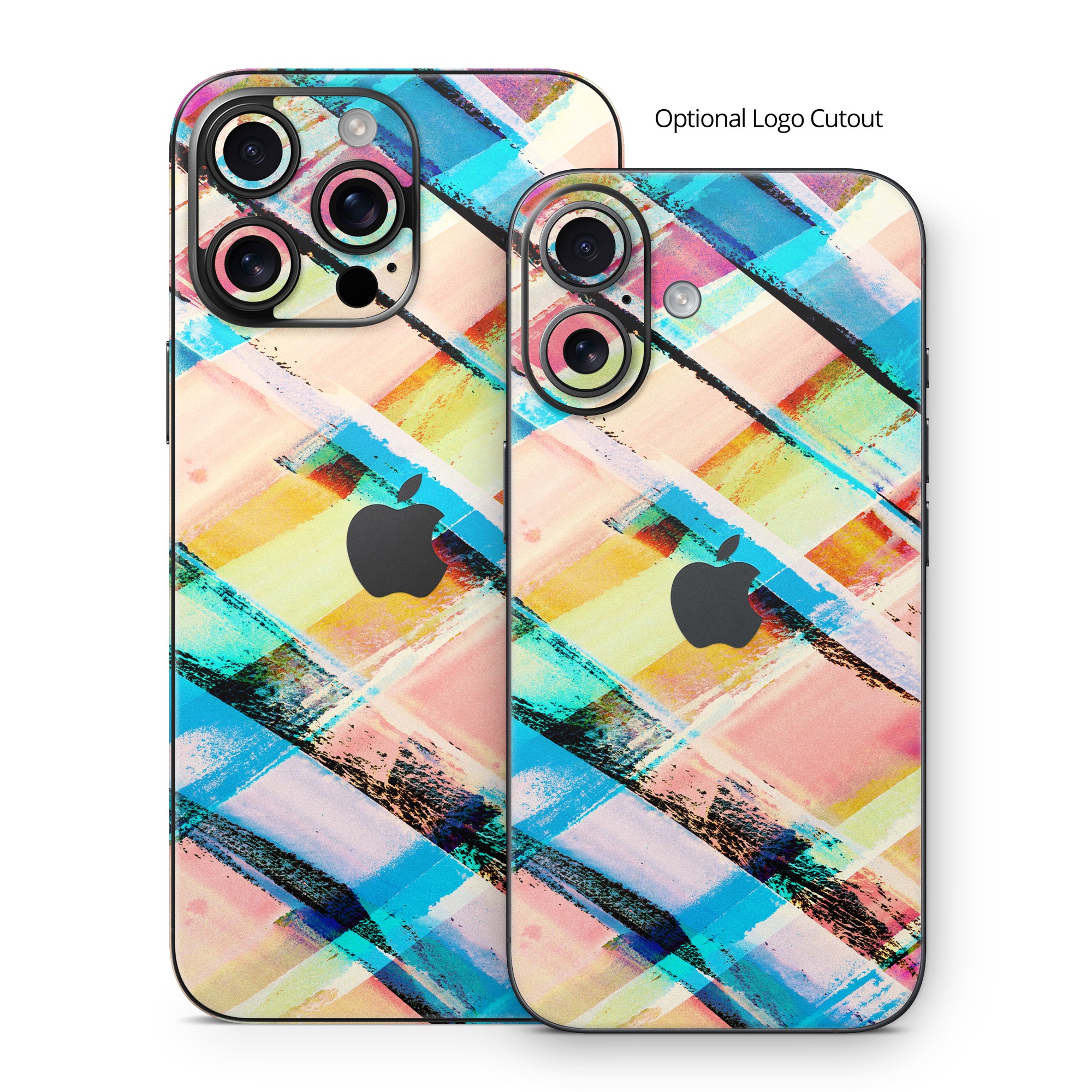 iStyles iPhone 16 Series Skin design of Line, Pattern, Turquoise, Plaid, Orange, Colorfulness, Design, Textile, Tints and shades, with blue, pink, red, purple, yellow, orange colors, and tagged with patterns, abstract, bright, pastel, stripes, watercolor.