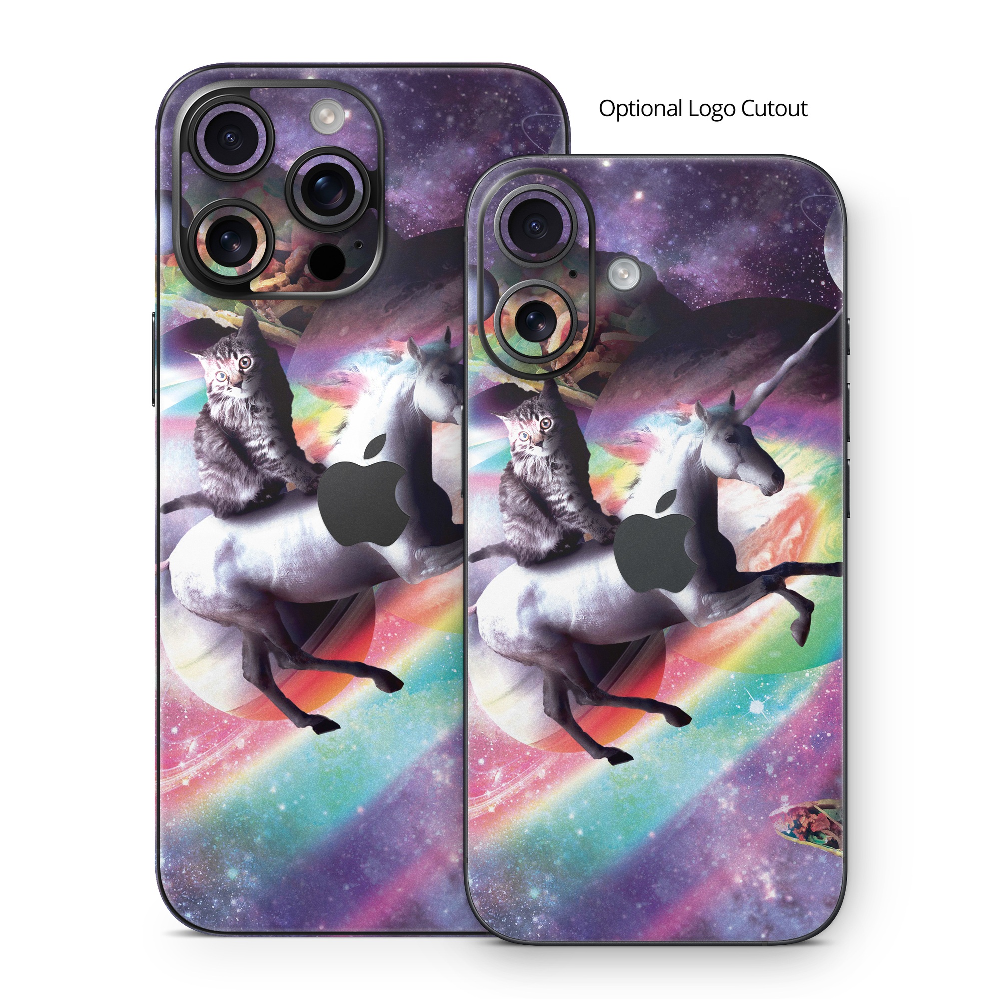 iStyles iPhone 16 Series Skin design of Illustration, Graphic design, Fictional character, Space, Sky, Astronomical object, Universe, Outer space, Art, Unicorn, with black, white, gray, red, yellow, green, blue, orange colors, and tagged with space, animals, fantasy, animals, funny, galaxy, lasers, random, space, weird.
