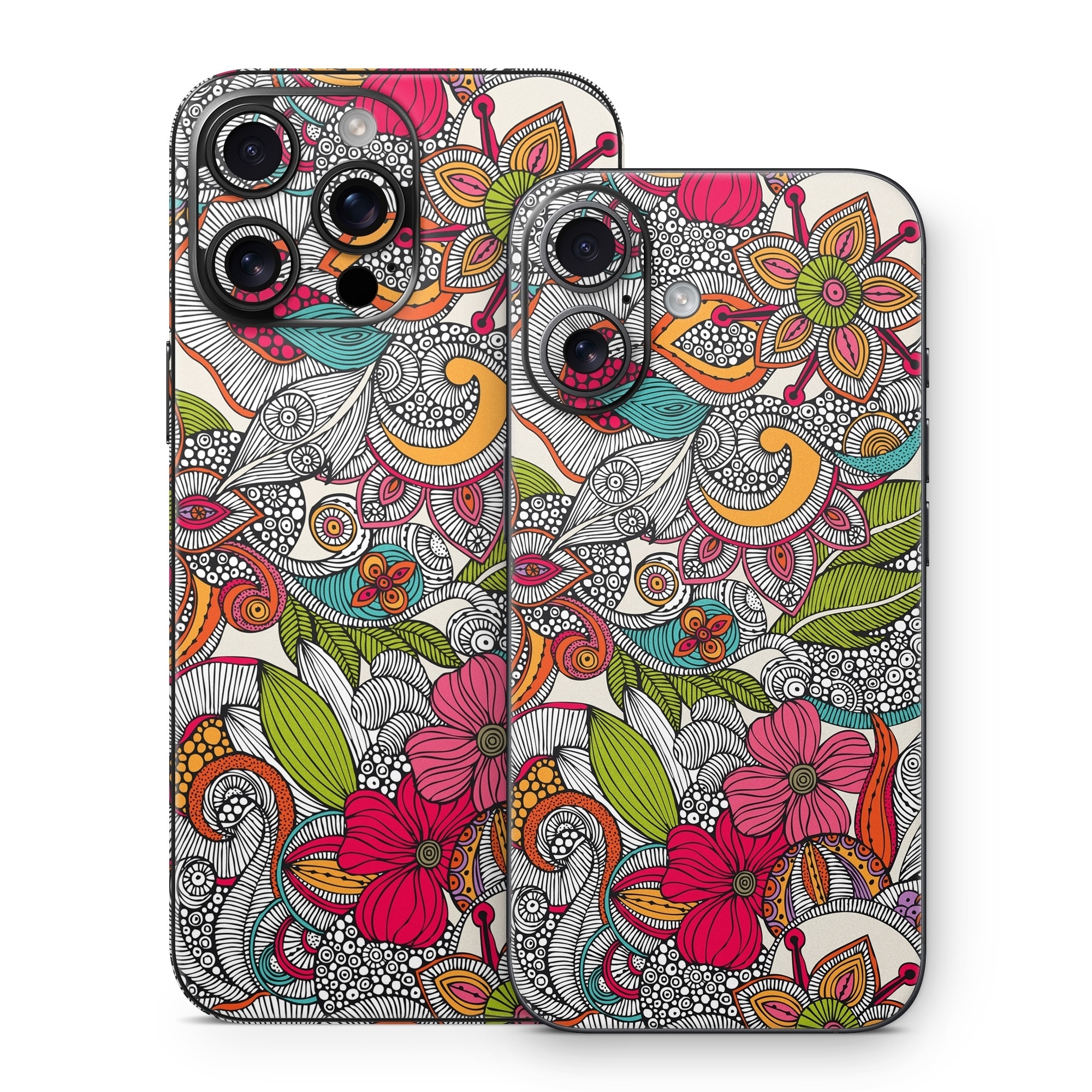 iStyles iPhone 16 Series Skin design of Pattern, Drawing, Visual arts, Art, Design, Doodle, Floral design, Motif, Illustration, Textile, with gray, red, black, green, purple, blue colors, and tagged with flowers.