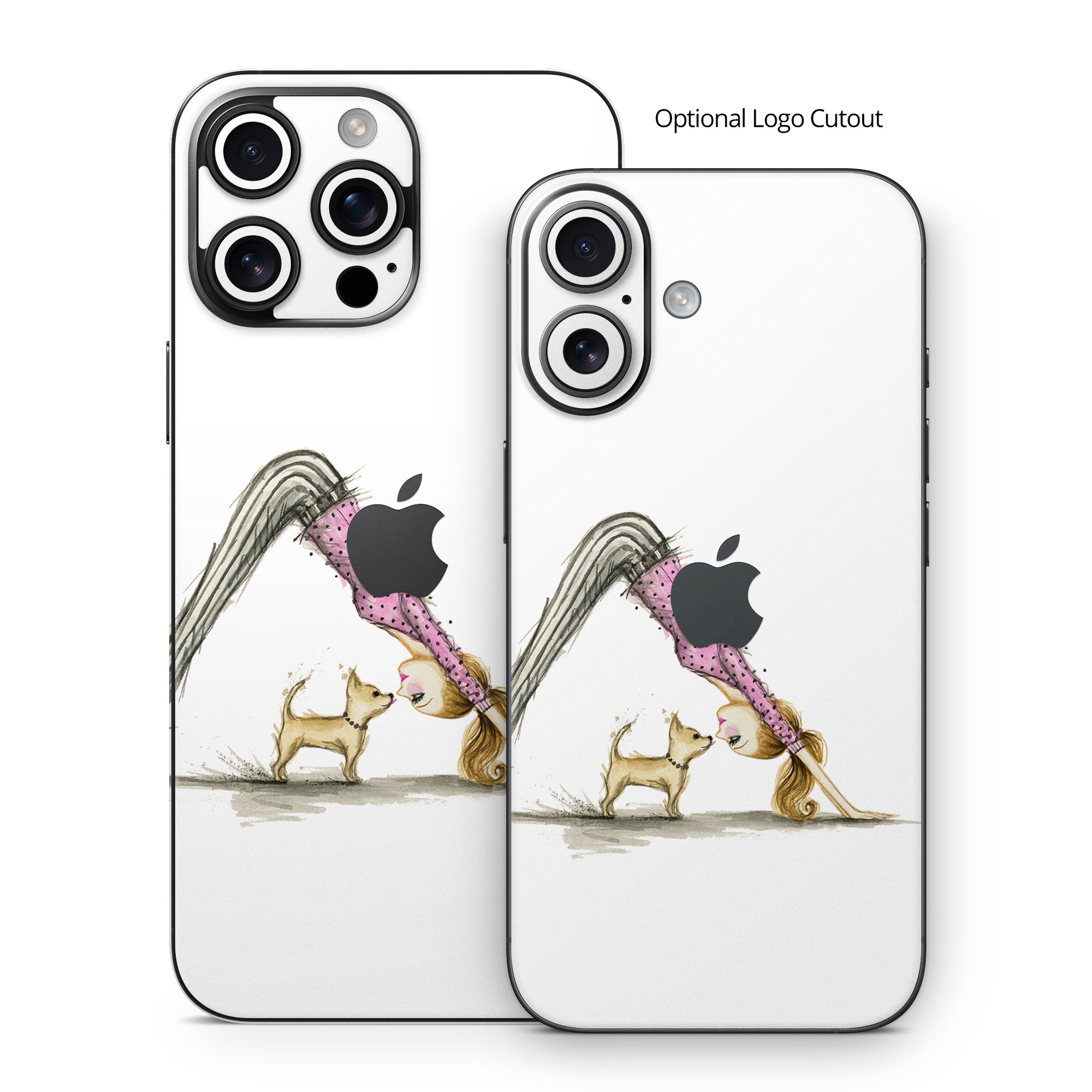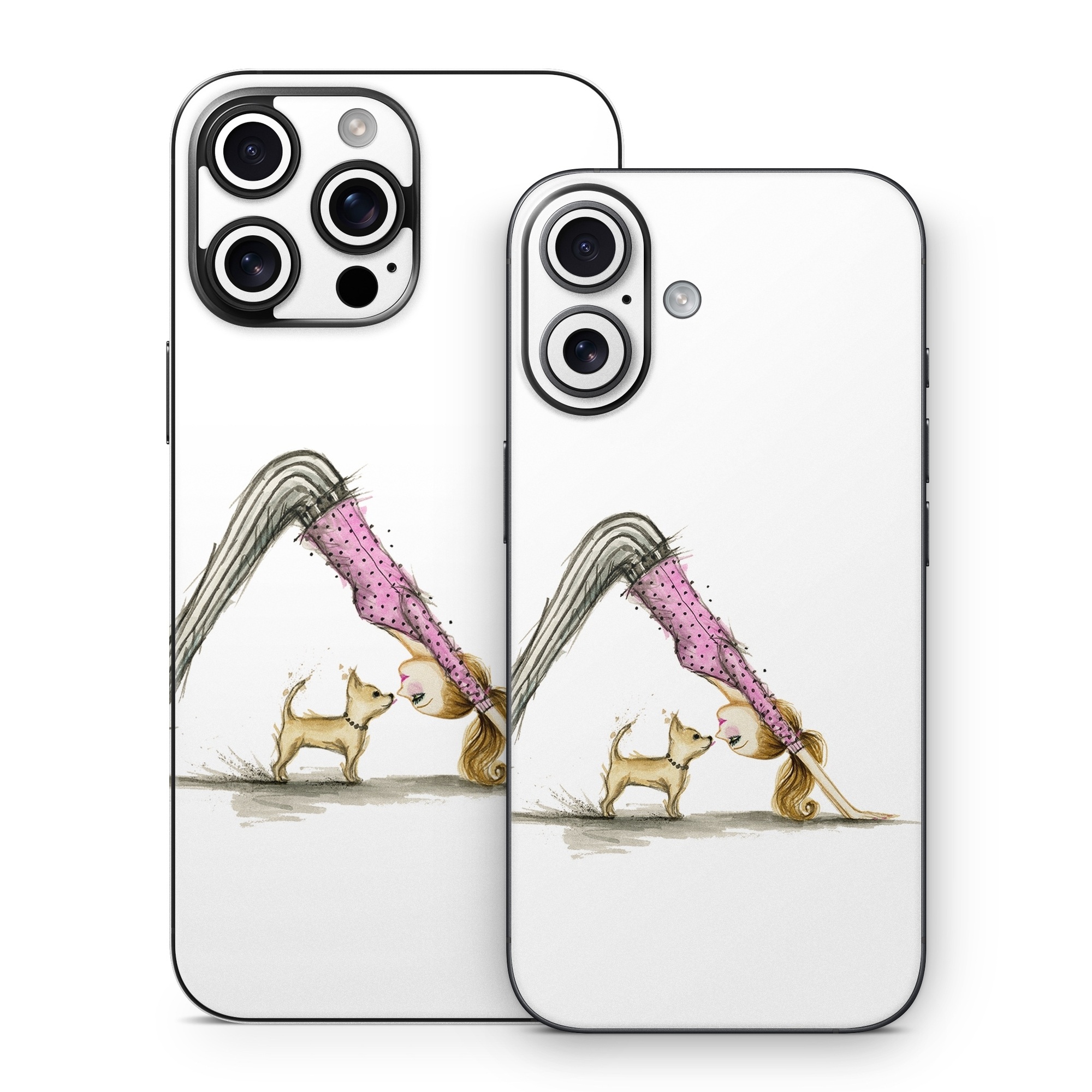 iStyles iPhone 16 Series Skin design of Drawing, Illustration, with white, pink, black, white, brown, yellow colors, and tagged with people, fineart, fashion, animals, animals, dog, fashion, fitness, yoga.